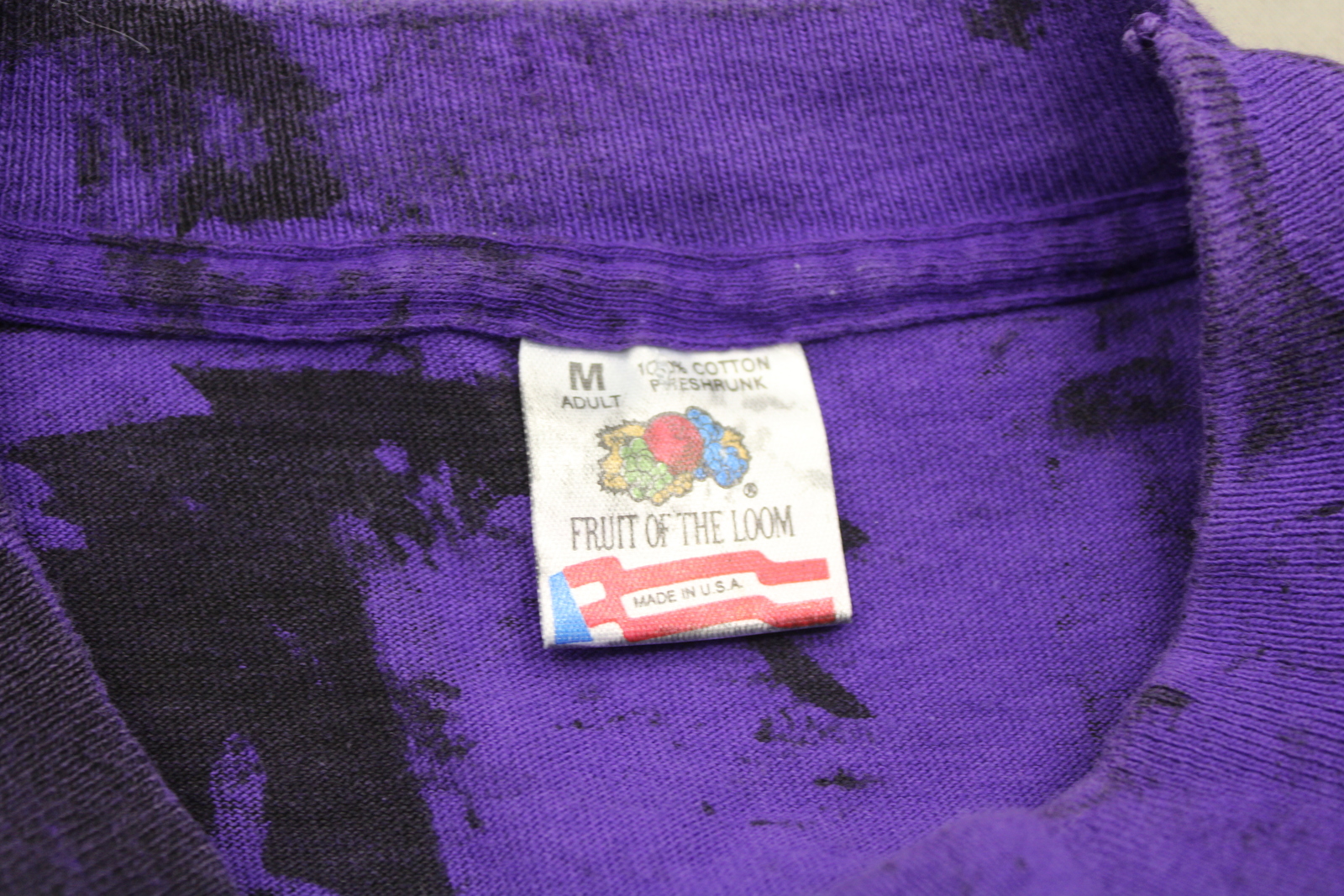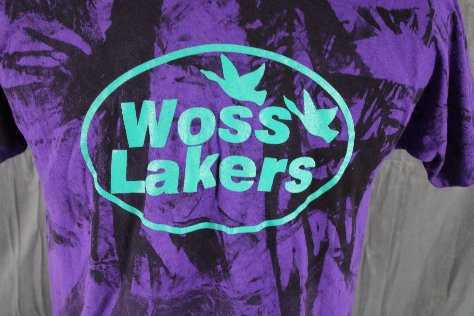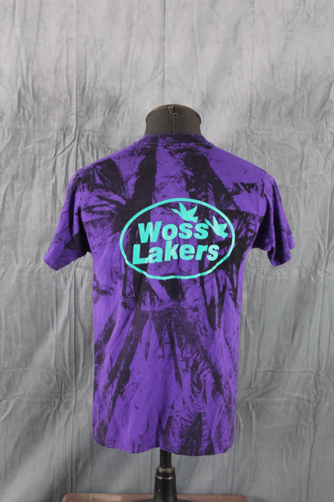 Up for sale is a vintage graphic t-shirt. It has a purple base colour with black tie dye over the top. The back fo the shirt has the Woss Lakers screened on in green from shoulder to shoulder. What a great shirt do not miss out on it.