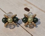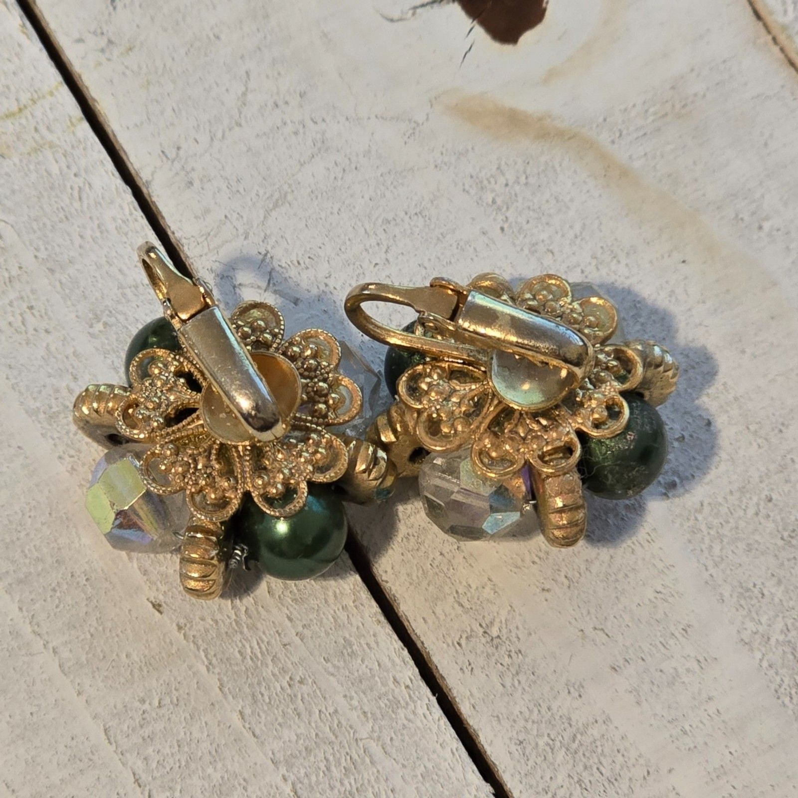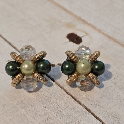 These vintage clip-on earrings feature a clustered button-style design with deep green faux pearls, pale gold faux pearls, and faceted clear crystal beads accented by gold-tone spacers. Their elegant retro look makes them a versatile accessory for both formal and everyday outfits.
