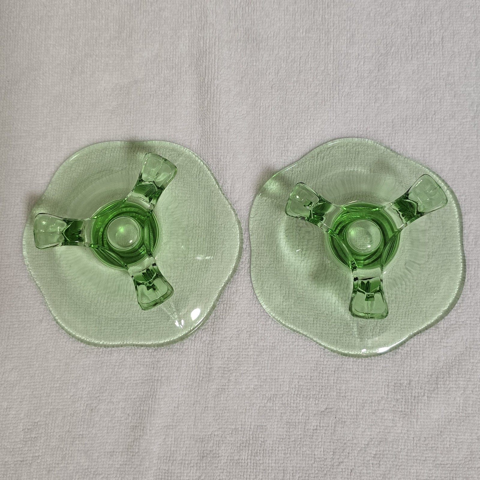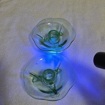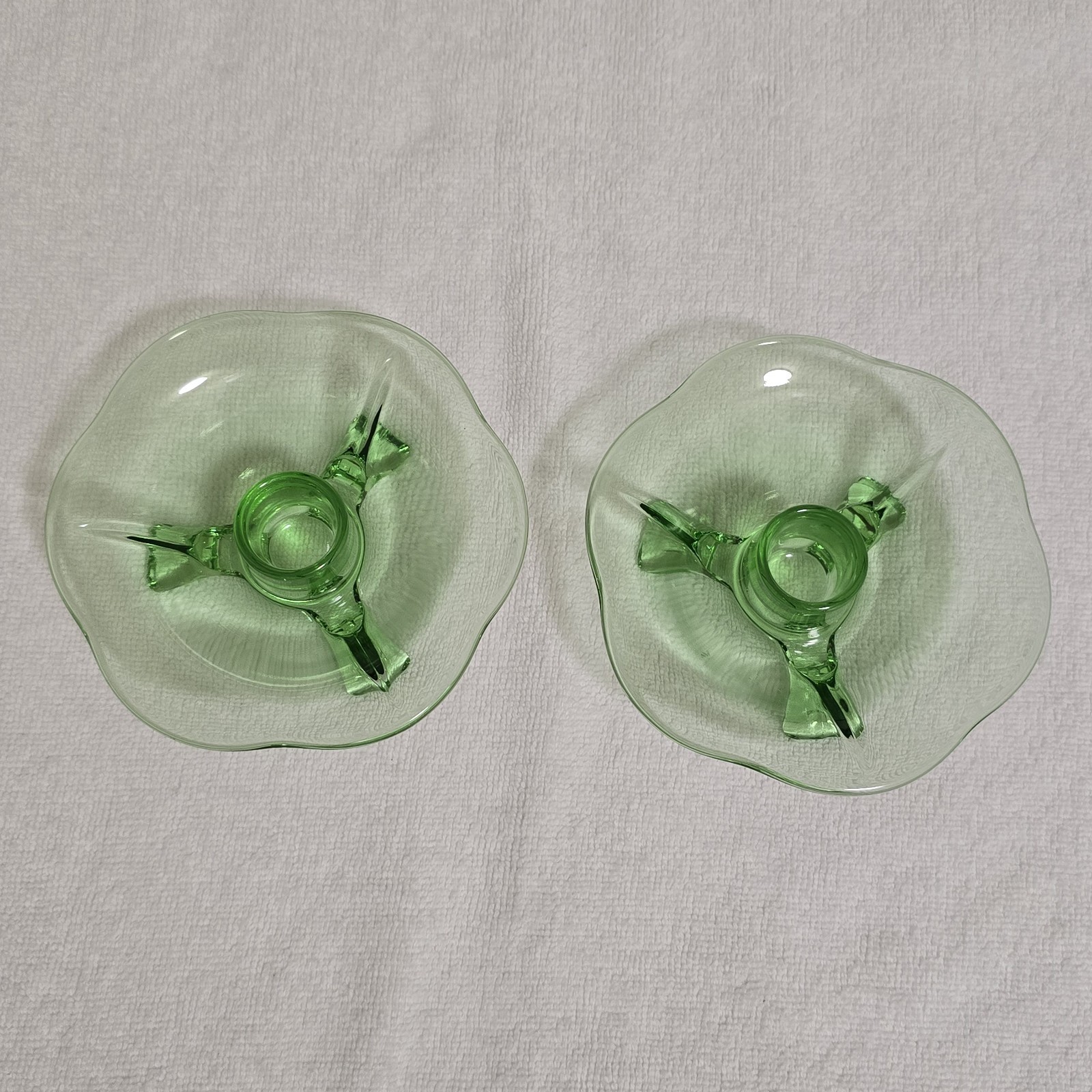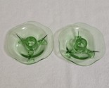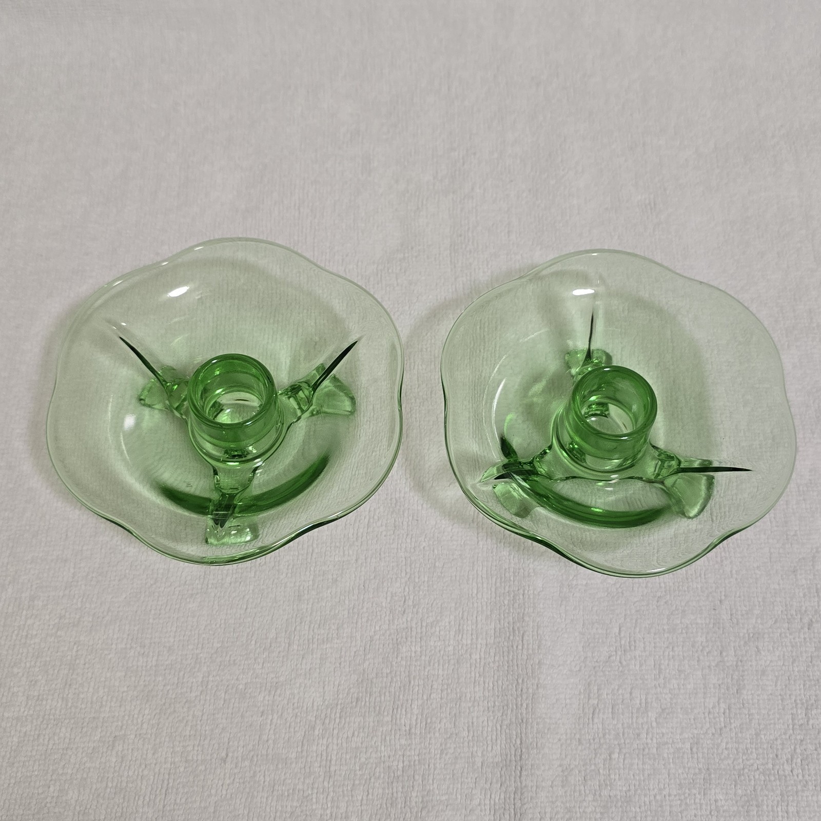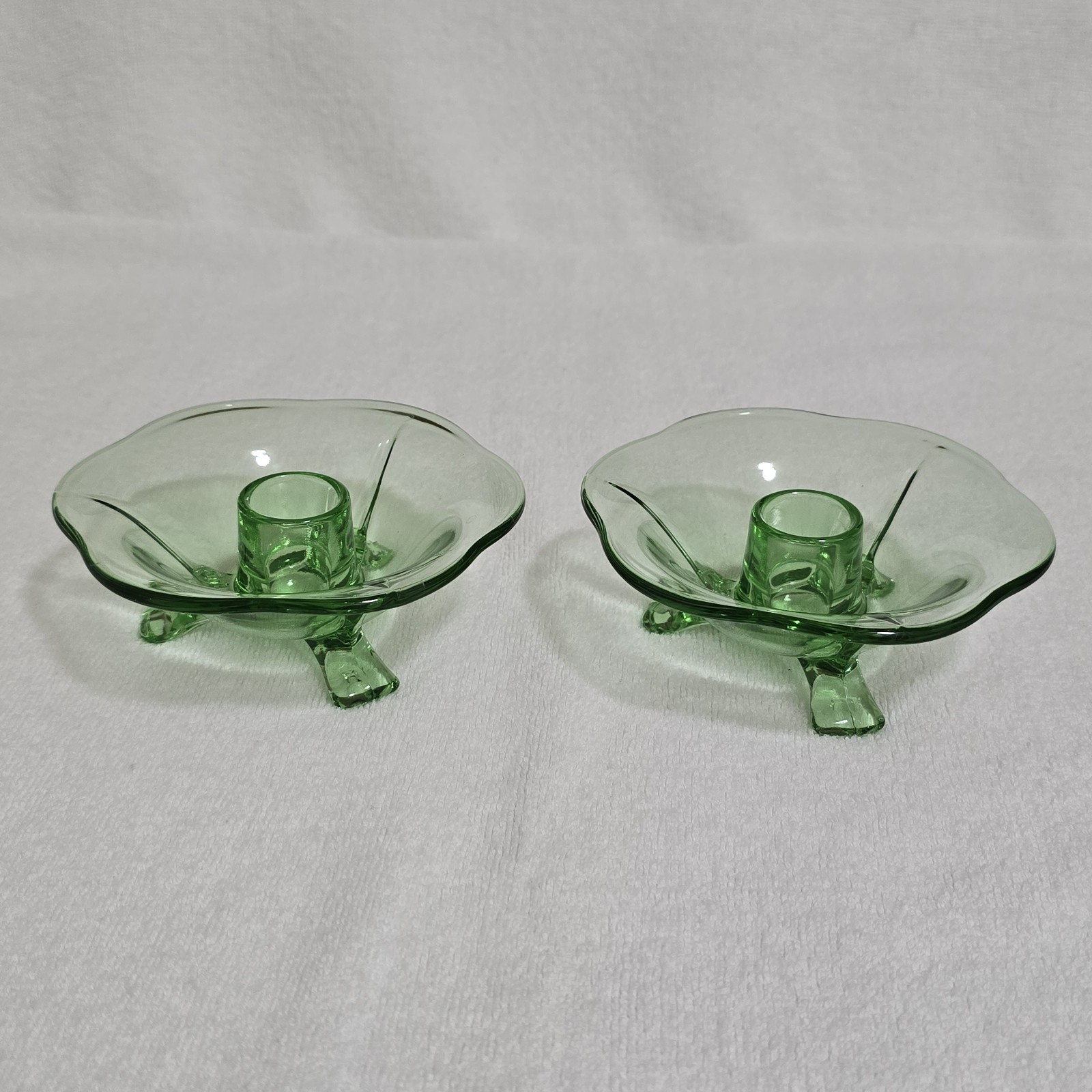 - Vintage Green Uranium Lotus 3 Footed Glass Candlestick Holders Set of 2