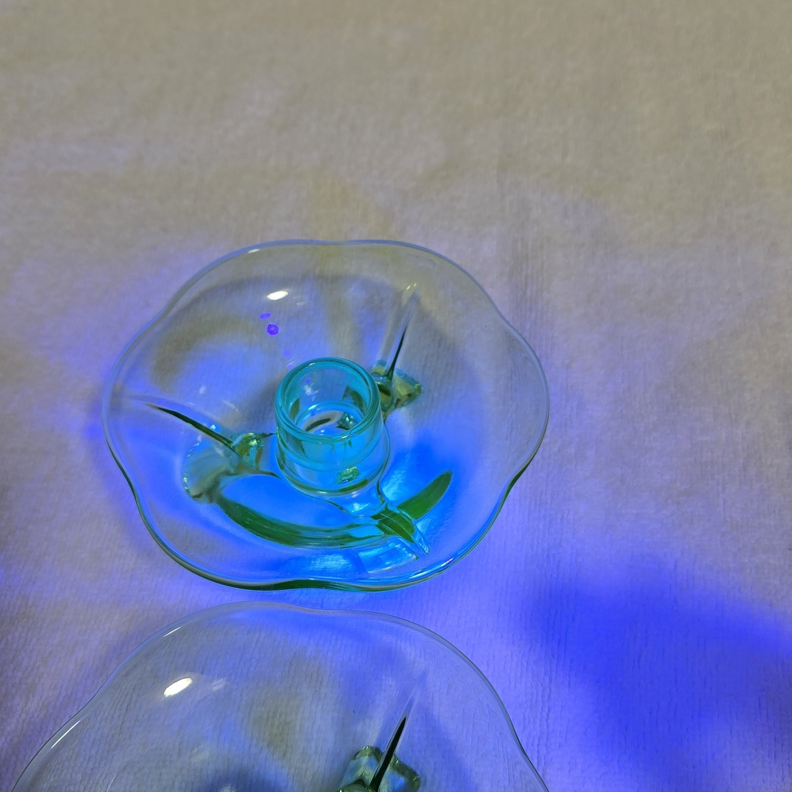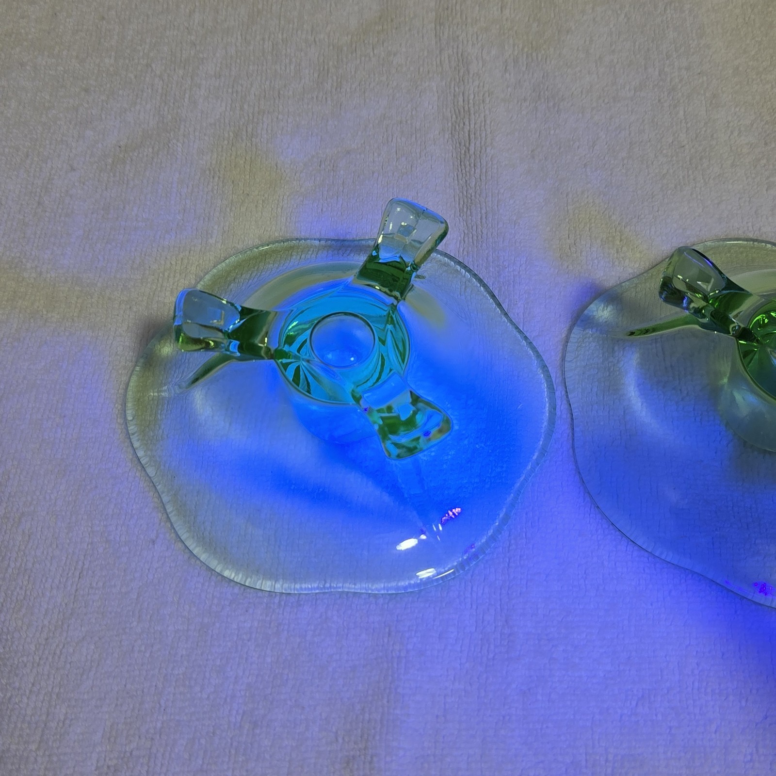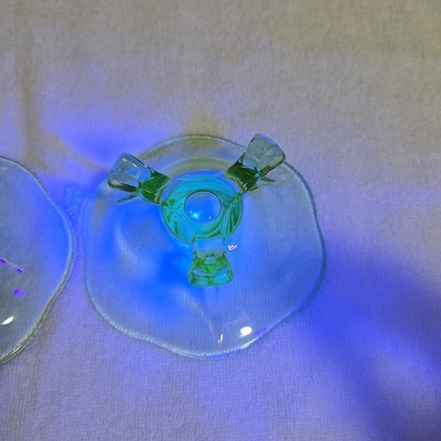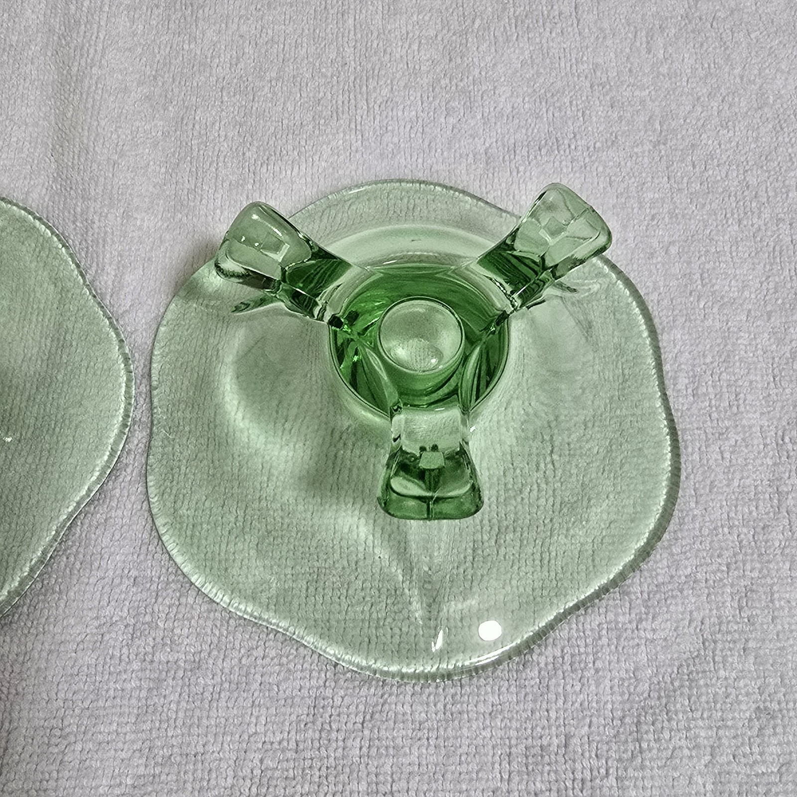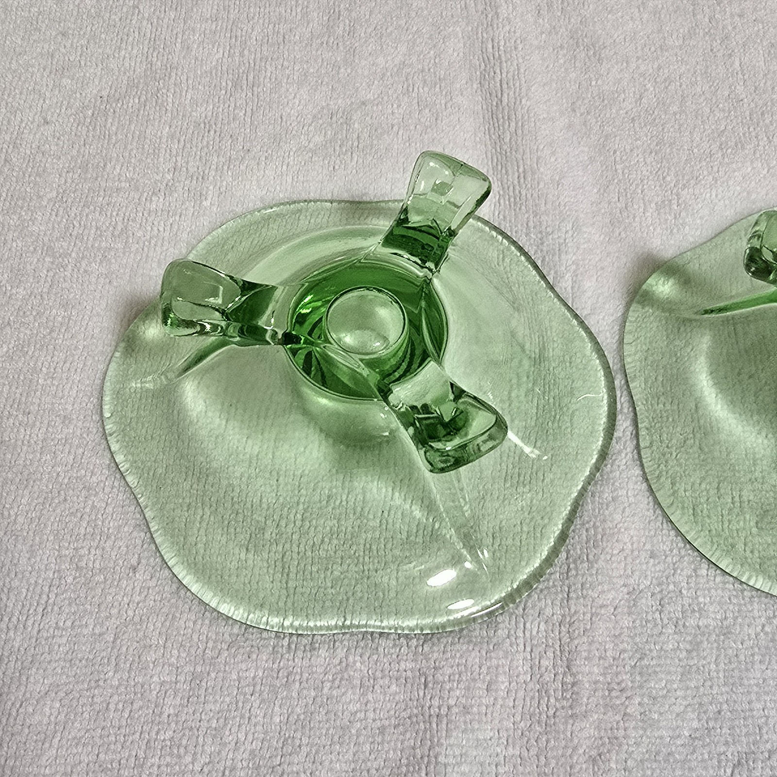 - Vintage Green Uranium Lotus 3 Footed Glass Candlestick Holders Set of 2
