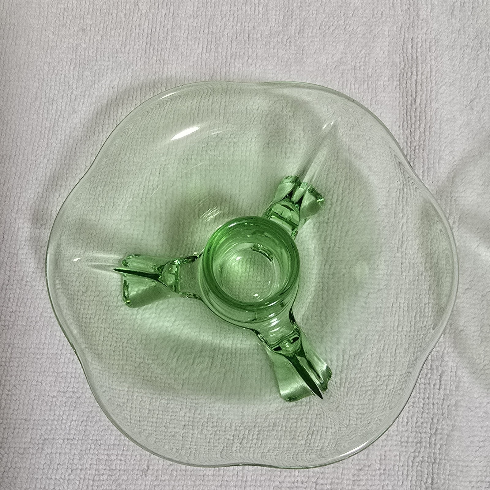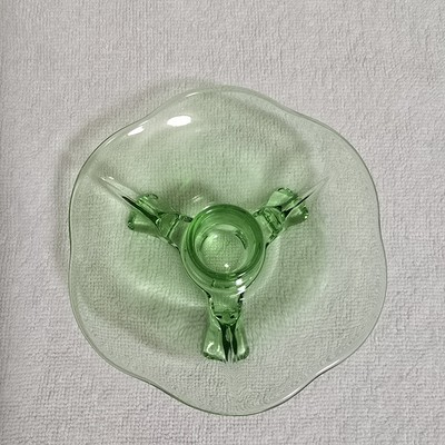 Beautiful Condition Vintage Green Uranium Lotus 3 Footed Glass Candlestick Holders Set of 2