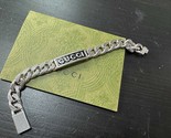 - Vintage Gucci Men Bold Logo Plague Black Enamel Silver Tone Link Chain Bracelet