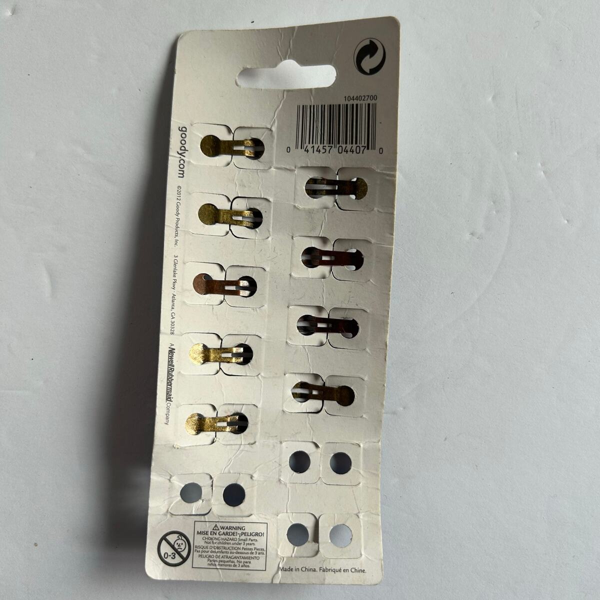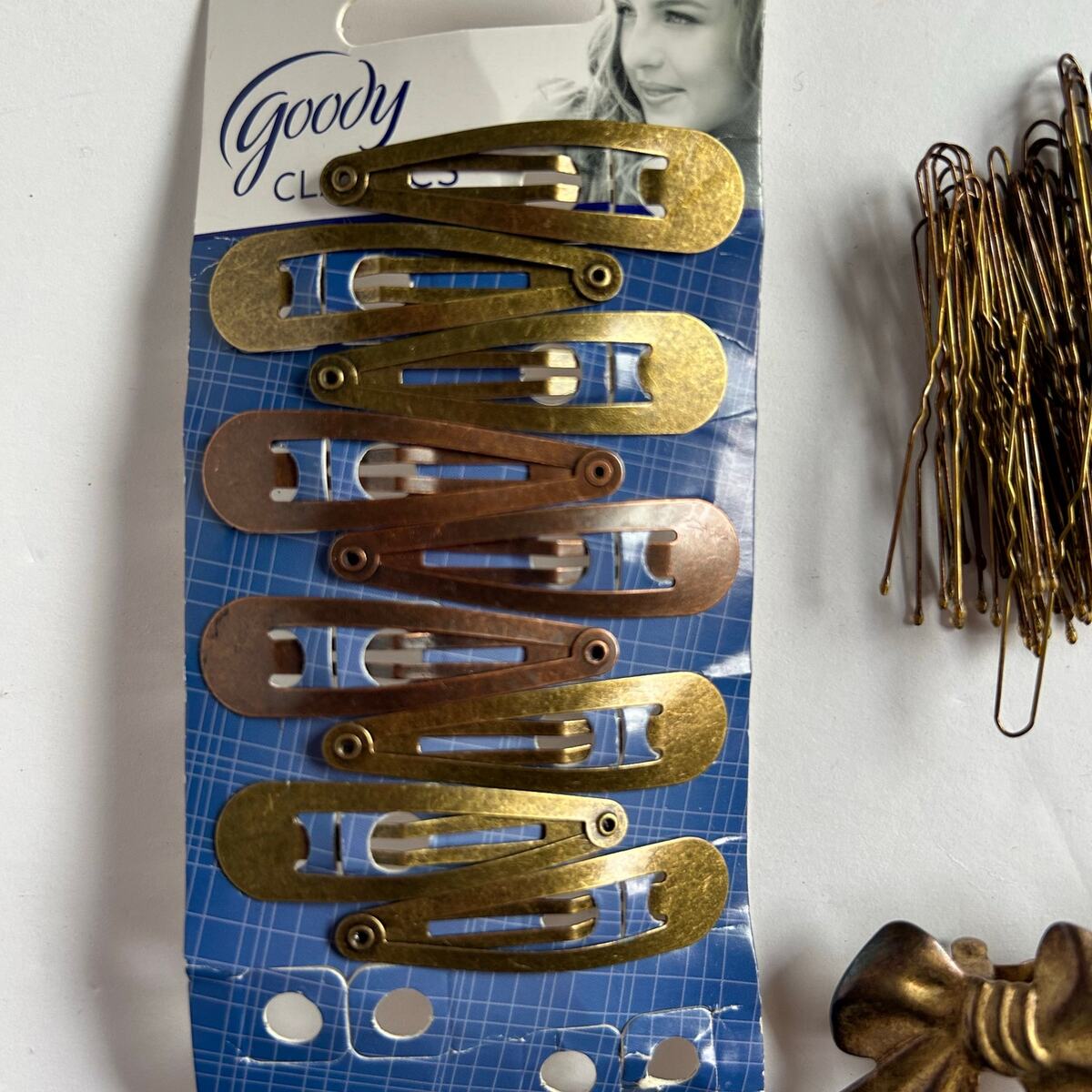 Bundle of vintage hair accessories, including an 80s metal triple-bow barrette, a full card of Goody snap clips, and assorted vintage bobby pins/hairpins.