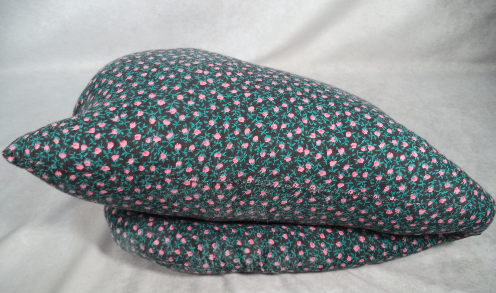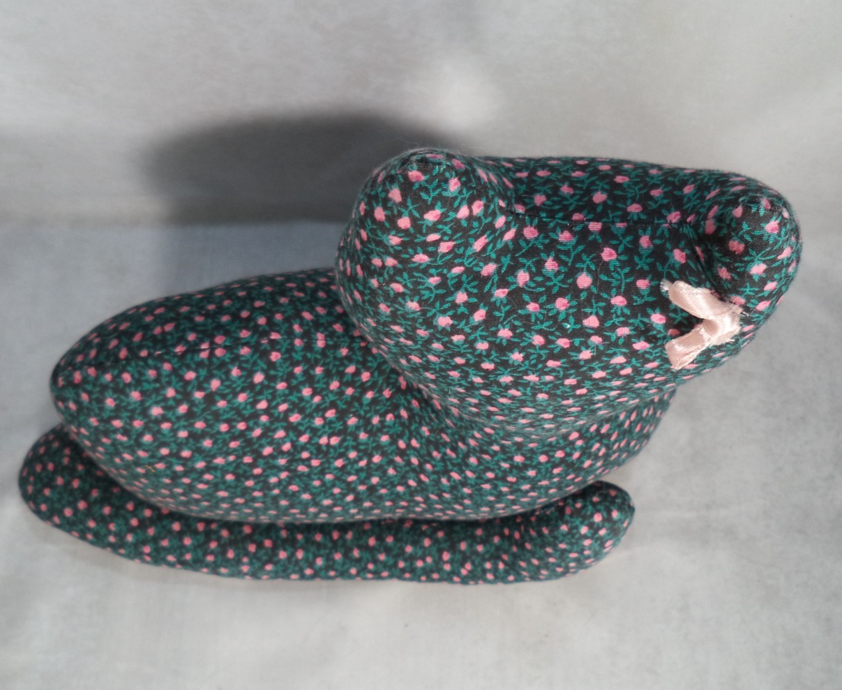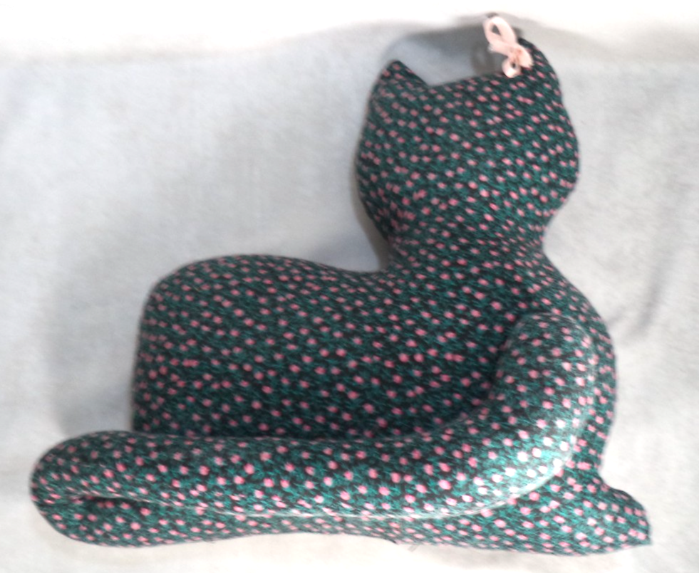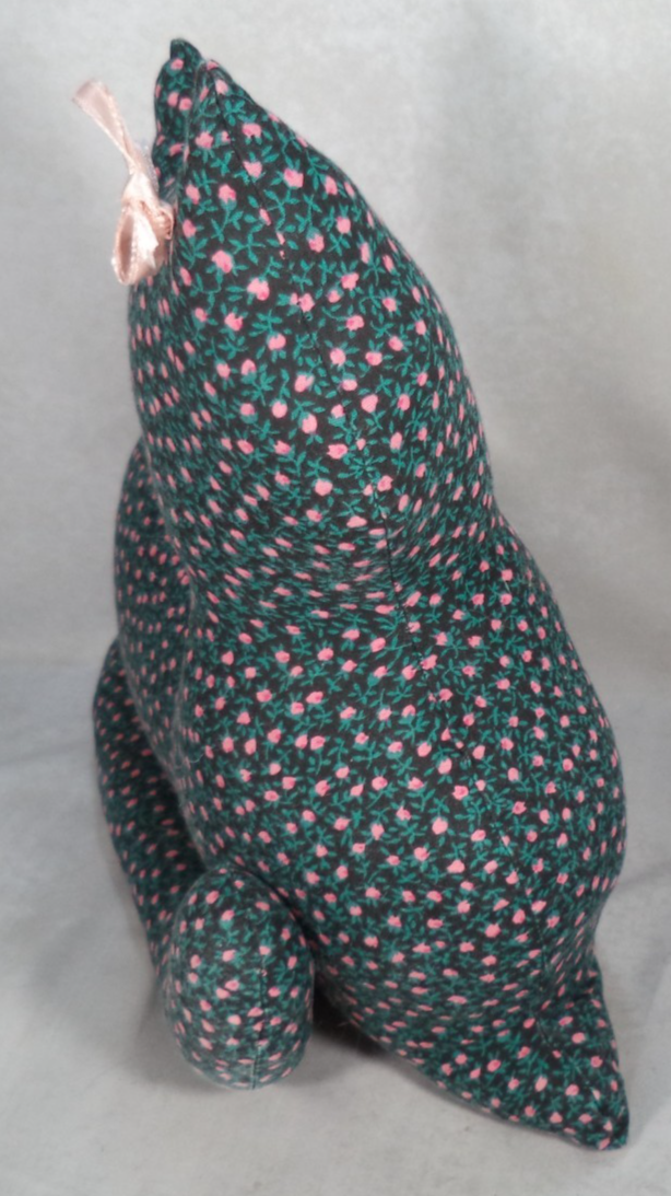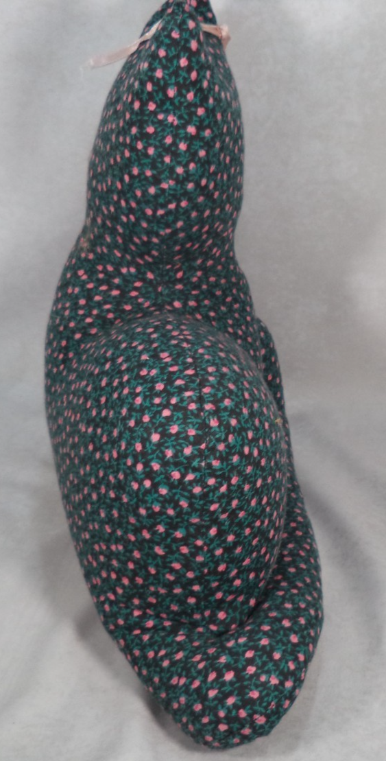 Description: Adorable cat with pink and green flowers and pink bow. Great for decoration or even a doorstop! It's a charming addition to any farmhouse, cottage, or cat lover's collection. Made in the United States with care and attention to detail, this unique piece showcases the artistry and craftsmanship of handmade items. The fabric cat features intricate floral designs, adding a whimsical touch to any space. Perfect for collectors who appreciate one-of-a-kind handmade pieces and those who love cats and rustic decor.