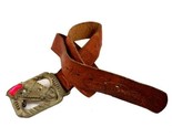 Vintage Hand Tooled Leather Belt Gun Buckle 1970's SZ 28 measures 30" x 1 3/8" hand tooled leather belt of Top Grain Briole Cowhide, with a sort of pot metal hook style buckle. The gun handle has a hot pink plastic piece on it. I wonder if there was some other plastic on the rest. This is as found. The leather isn't all that nice though it is in very good condition. The buckle measures 3 x 2 1/2".