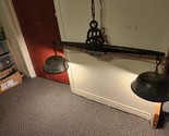 For sale is this Vintage Rustic Barn Farm House Light Fixture Hay Trolley Yoke One of a Kind. This item has made and hung in an old farmhouse that was dismantled and this was saved. One of a kind, hand made. Yoke measures 36" long, lamps are 10" in diameter, the chain measures 60". This item is rustic, please study photos before making your purchase, it is farm fresh! We spliced a plug into it but it will likely be hard wired so plug could be removed. Shipping will calculate based on dimensions and your location.