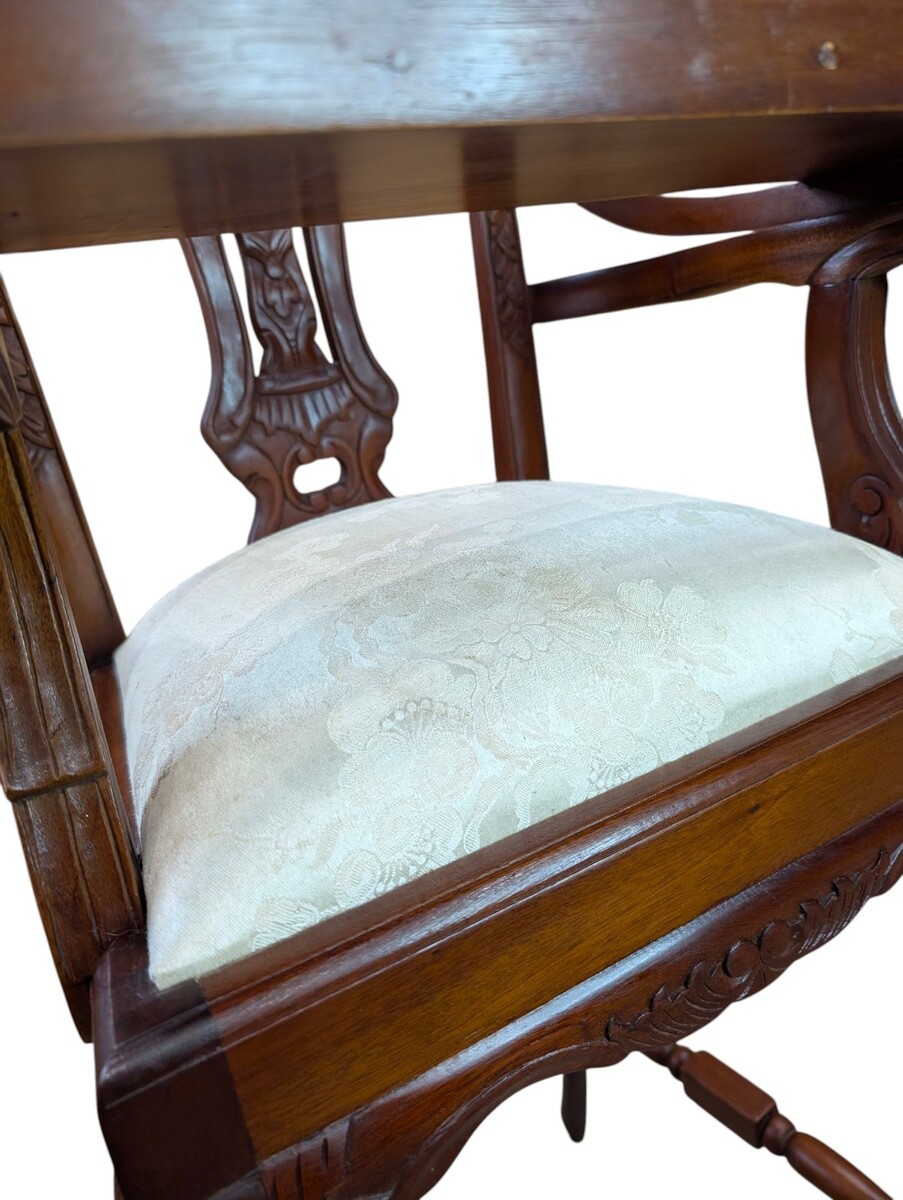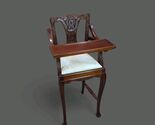 This is an absolutely gorgeous and incredibly detailed Chippendale style vintage high chair. Dark mahogany wood with ivory colored seat. The only real signs of wear on the very back of the high chair where it looks as if it had been leaning up against a wall or a chair rail or something. Other than that this is in excellent condition! No staining on the seat. Simply stunning! This item is for local pickup only. Willing to meet up within a reasonable distance. Item is located in Ohio.