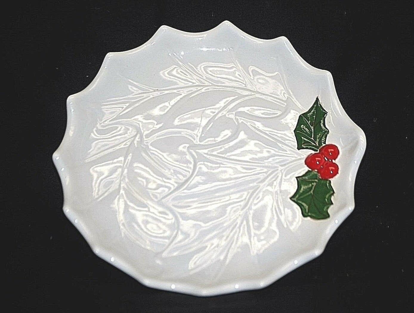 Vintage Holland Mold White Christmas Holly Berries Footed Cookie Serving Plate