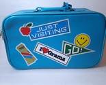 Missing one of the feet from the bottom. Scuffs/wear/light stains/marks as shown. Rare teal blue color. Vinyl. Lovely suitcase to take to grandma's house! Retro feel with images that say JUST VISITING, I LOVE GRAMA, a smiley/smile face, a GO! pendant and airline tickets. Super cute!