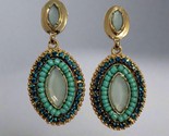 Add a pop of color and elegance with these blue and gold dangle earrings. Featuring oval drops framed in turquoise seed beads and sparkling blue rhinestones, the design centers around a faceted pale stone for a bold yet refined look. The gold-tone setting adds warmth and contrast, making them perfect for both casual wear and dressy occasions.