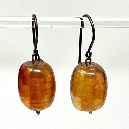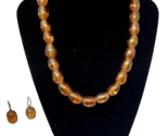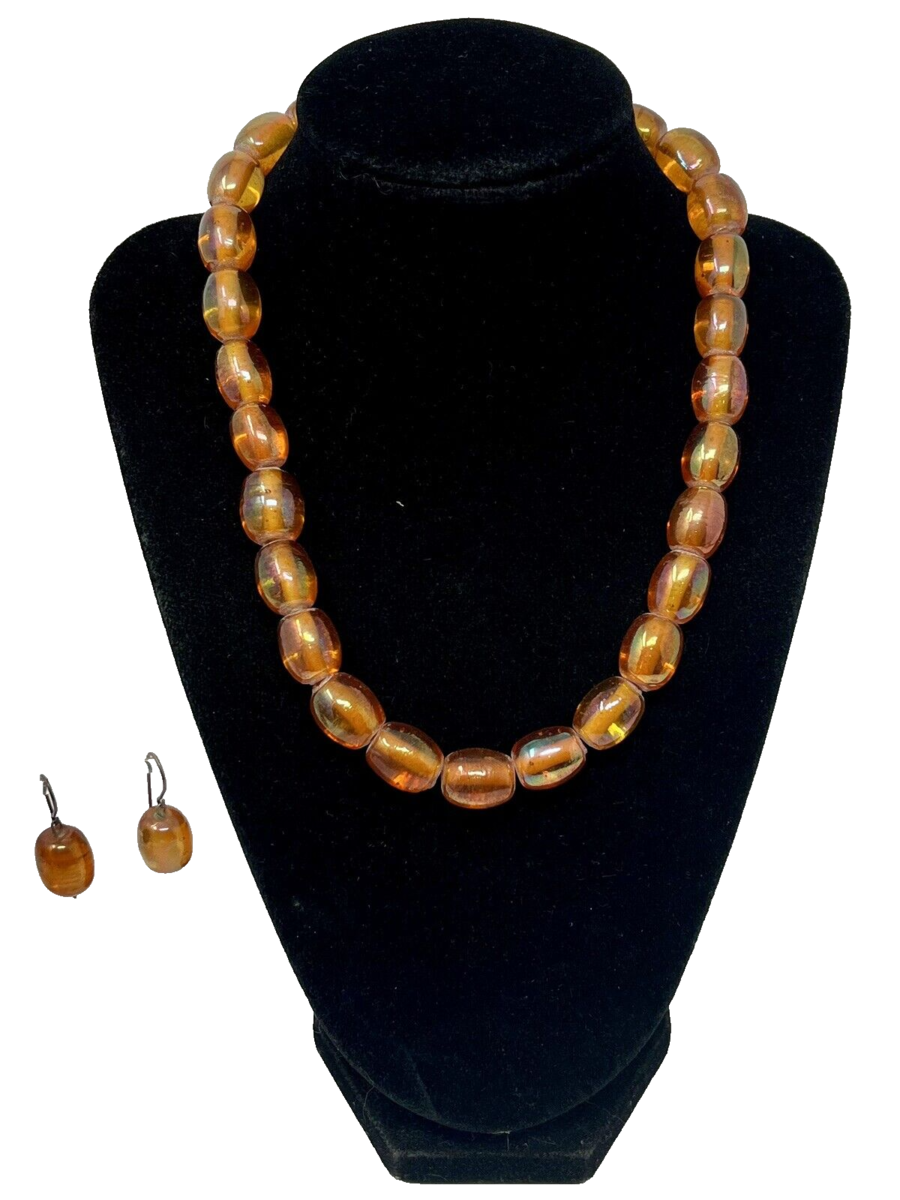 - Vintage Iridescent Oval Amber Glass Beaded Necklace and Pierced Wire Earrings