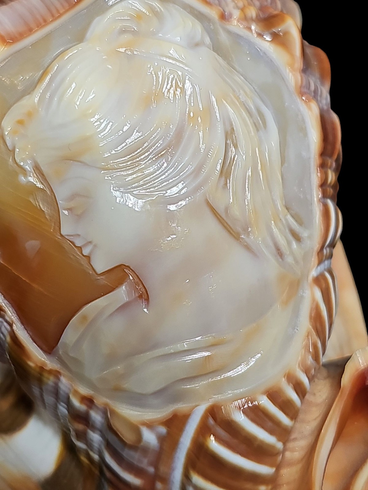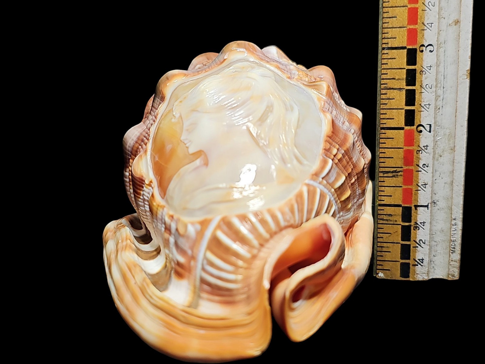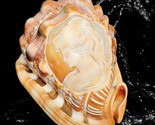 UP FOR SALE: This is a beautifully hand-carved cameo shell, likely made from a Cassis Cornuta (Horned Helmet Shell). The shell features a raised relief design depicting a classical or mythological scene, skillfully etched into the natural layers of the shell.