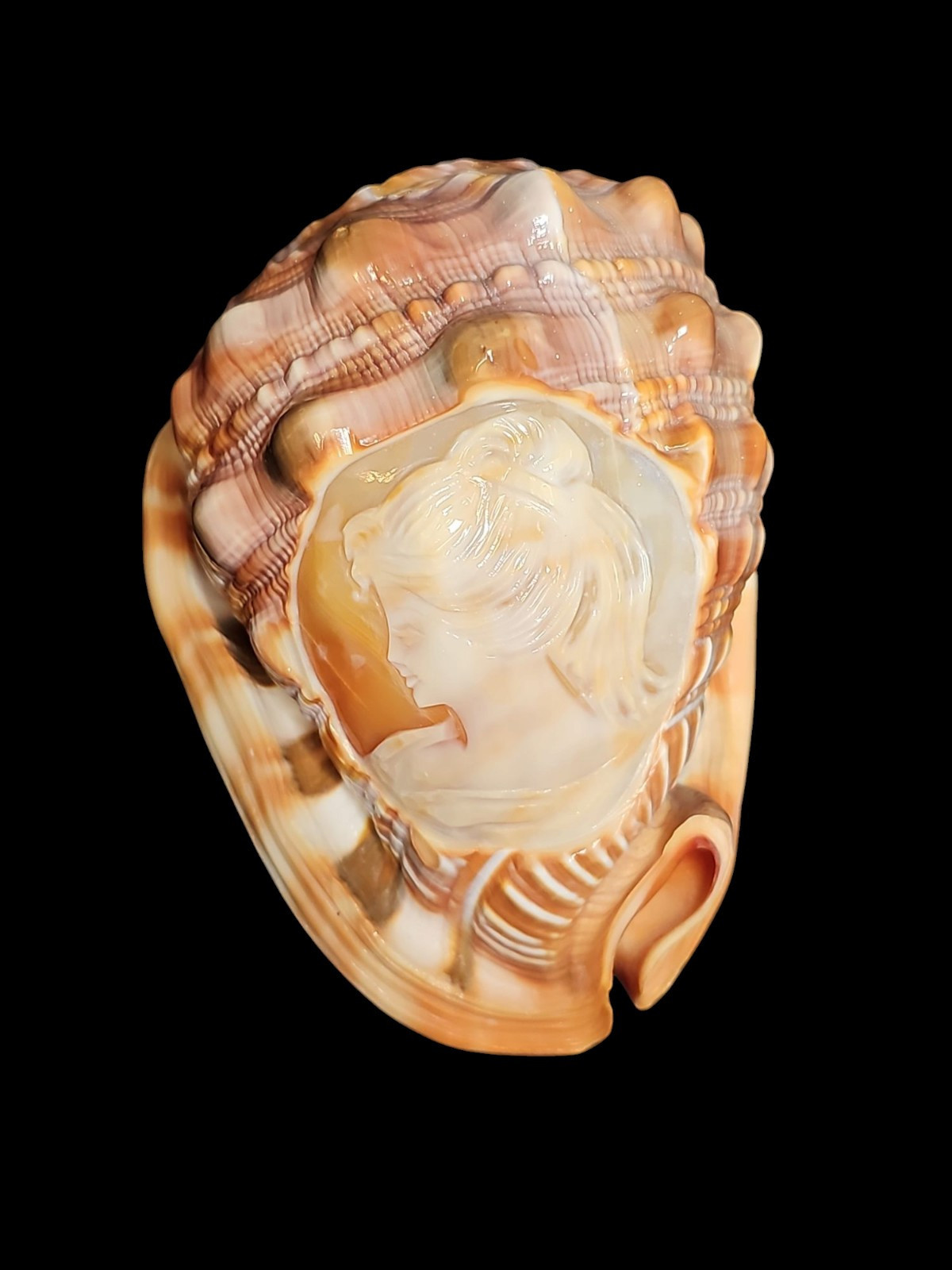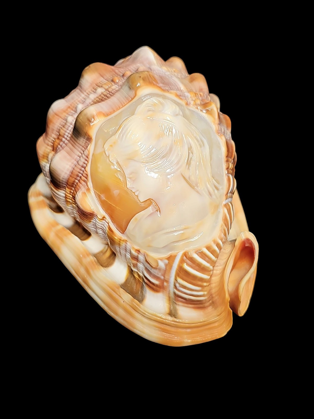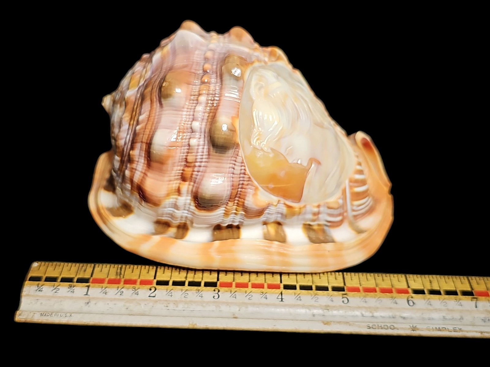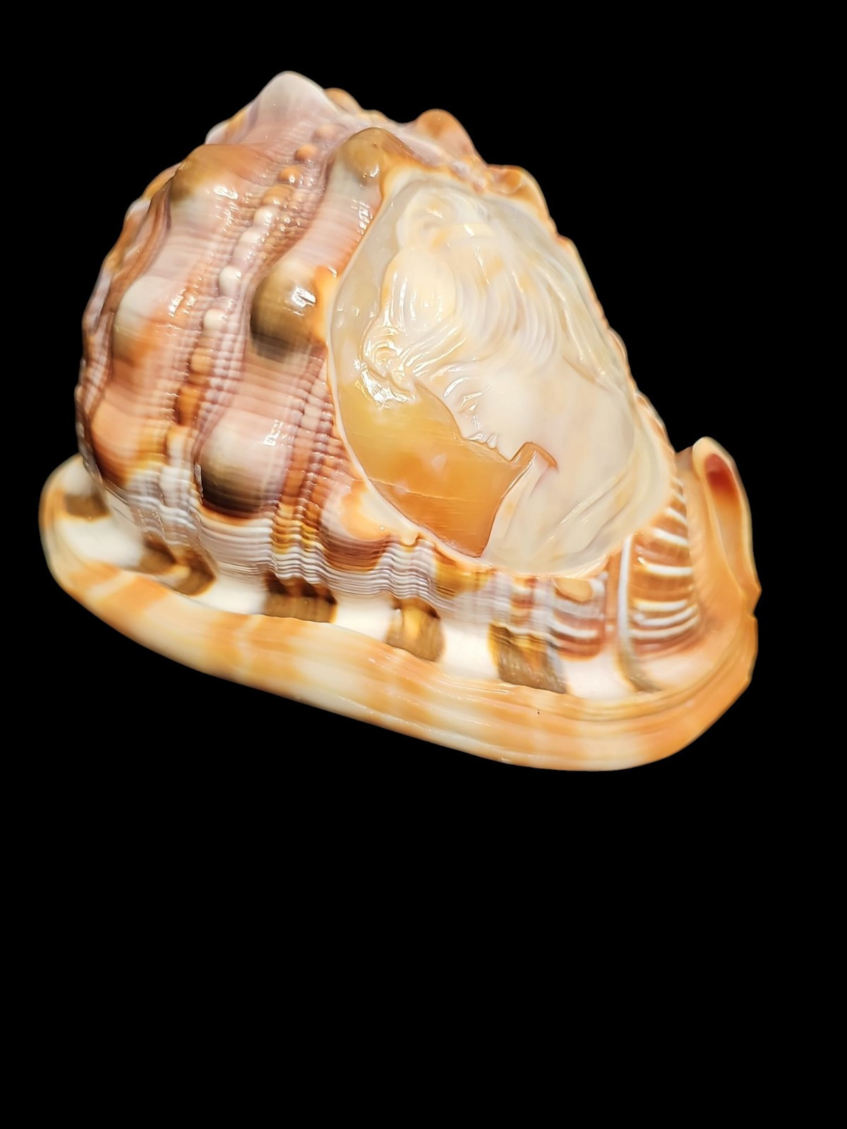 While often mistaken for a conch shell, this is a true helmet shell, which is commonly used in traditional Italian cameo carvings. This is a one-of-a-kind, artisan-crafted piece that showcases the artistry of shell engraving.