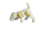 Charming vintage porcelain dog figurine featuring a terrier-style design with a glossy white glaze and hand-painted golden brown spots. Measuring approximately 3? long by 2? tall, this miniature collectible is perfect for display, curio cabinets, or dog lover gifts. The figurine has a classic mid-century look and adds nostalgic charm to any collection. Excellent for collectors of vintage porcelain animals or unique decorative accents. Preowned, no chips or cracks noted.
