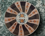 This 20 cm or 7 3/4 inch beautiful vintage porcelain plate features a striking geometric pattern with alternating panels of deep navy and ivory, each richly adorned with hand-painted floral motifs in gold, orange, and red tones. The central medallion showcases an elegant floral arrangement, creating a timeless and sophisticated design.