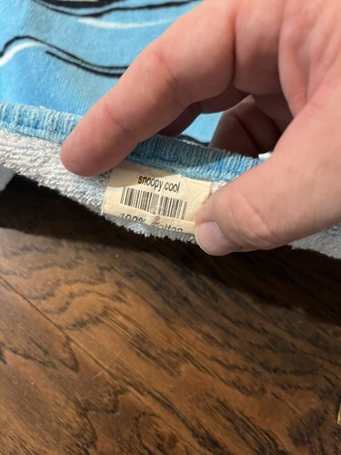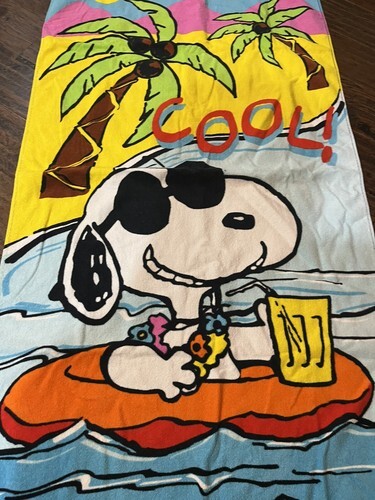 This vintage beach towel features a fun and playful design of Joe Cool and Snoopy surfing on a palm tree. The towel is made of 100% cotton and measures 28 inches by 55 inches, making it the perfect size for use at the beach or pool. The multicolor pattern and beach theme make it a great addition to any bathroom or beach bag.