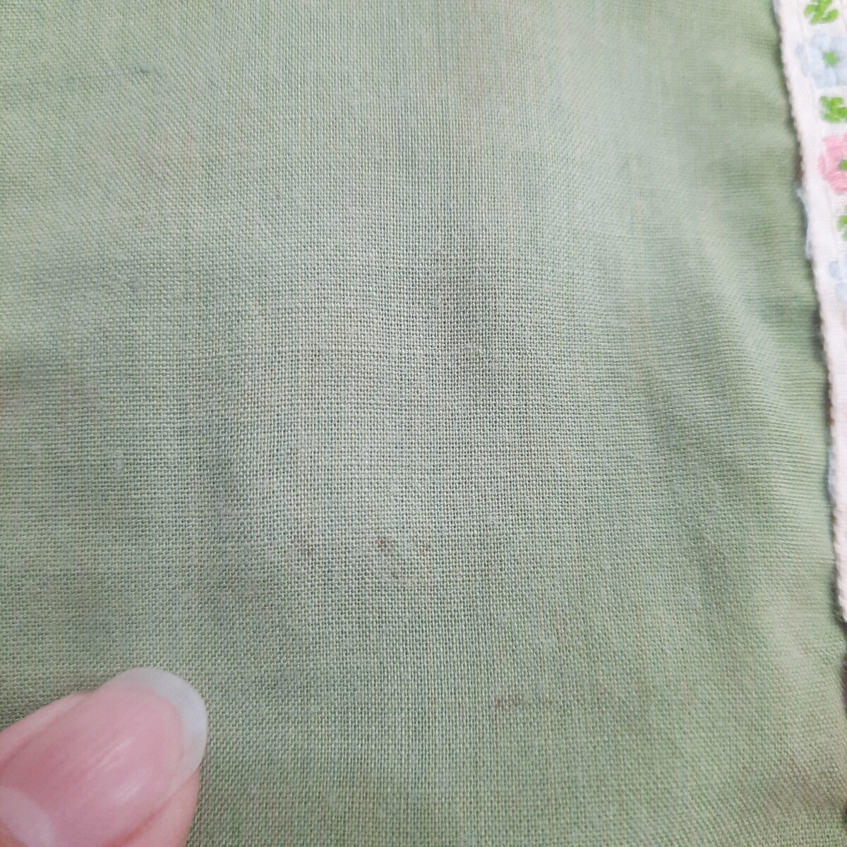 Some light colored stains/marks as shown. Lightweight cotton with peter pan collar, lace floral accents with pink belted waist. See pics for measurements as vintage sizing may vary.