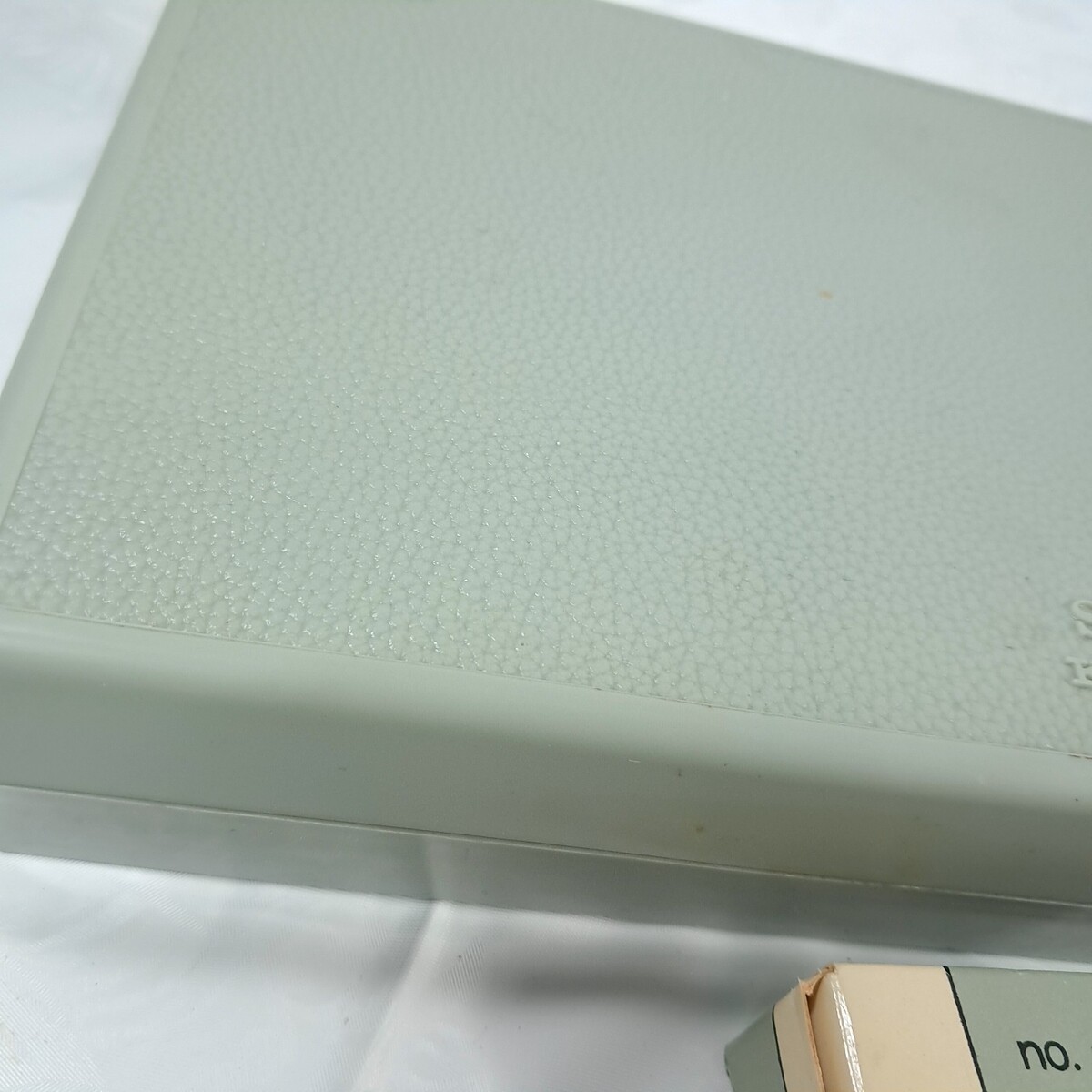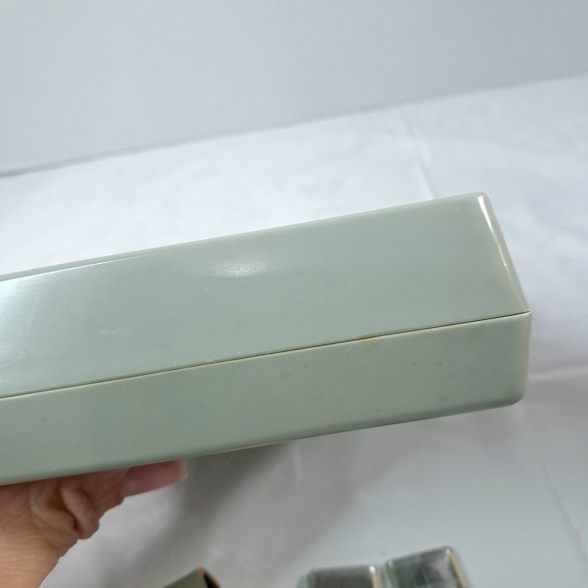 green plastic case (has some yellowing/marks as shown. Does NOT include cams as shown on inside graphic of lid to the case.