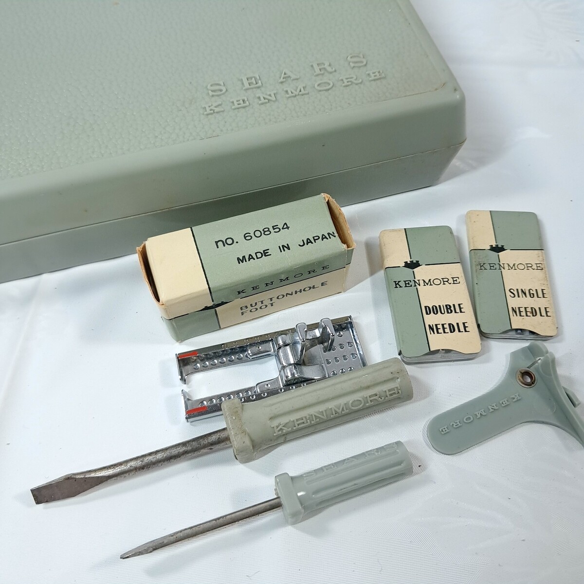 - Vintage Kenmore Sears Roebuck sewing attachment set green case Buttonhole Foot