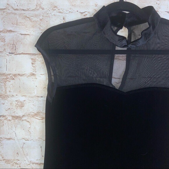 Vintage Kitty USA Black Velvet Sheer Maxi Dress Size Small / Black sheer sweetheart neckline with velvet body, sheer bottom split hem/keyhole back/ 95 polyester 5 Lycra