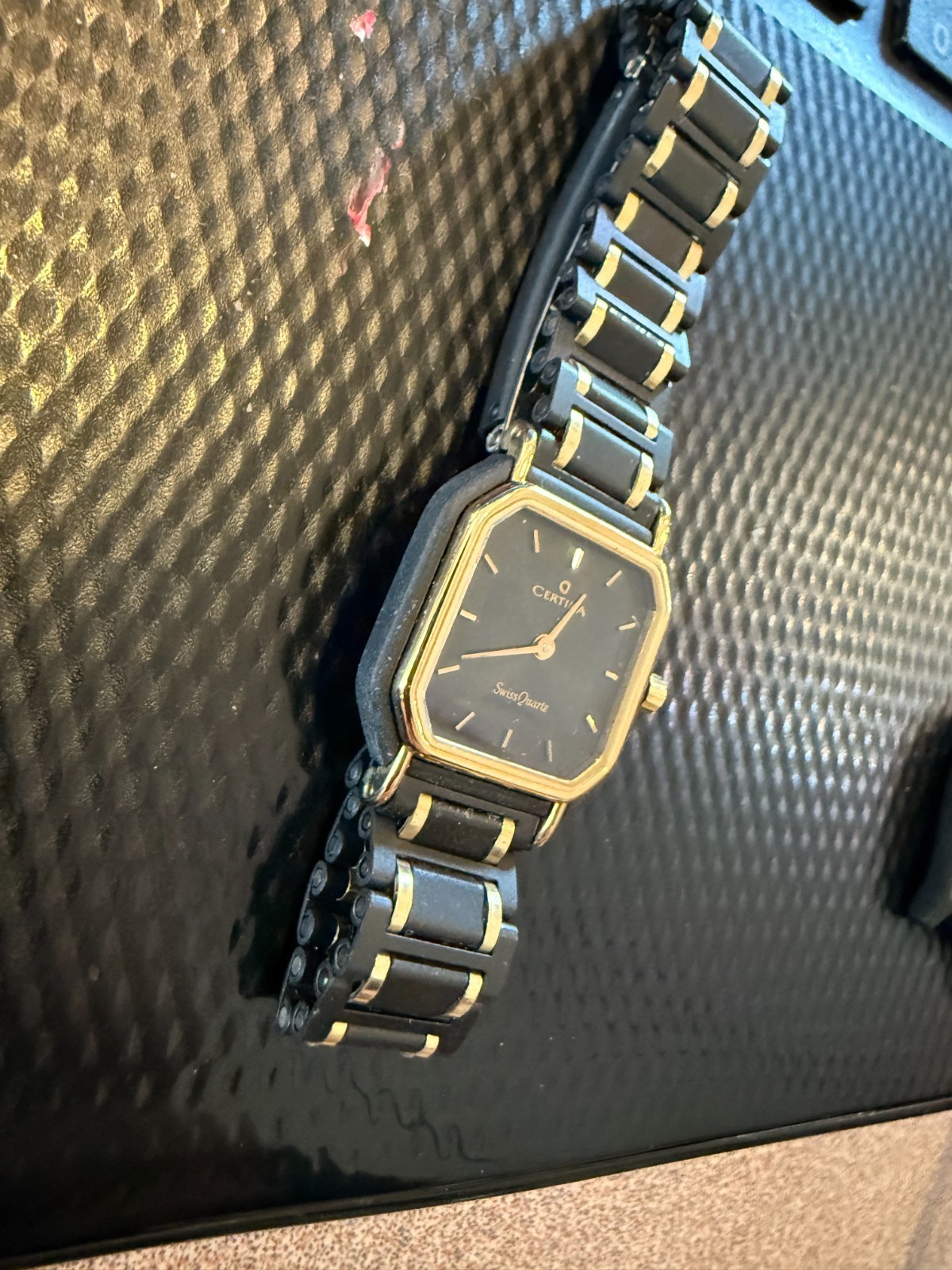 - Vintage Ladies Certina 1980's Watch w/ band Black Gold Square Quartz 30 Meters