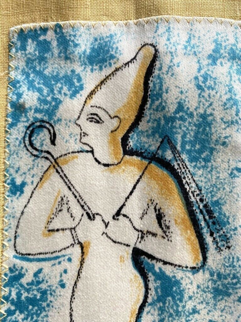 Vintage Linen Egyptian Motif FingerTip Towel Provenance Unused Gold Blue