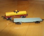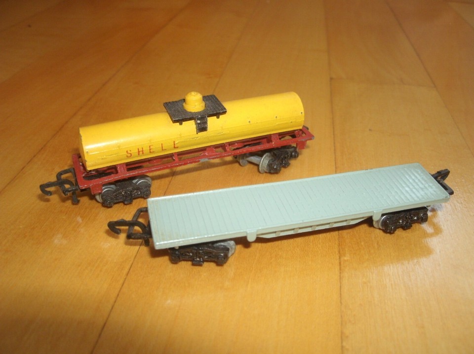 This lot of 2 vintage Lone Star diecast train cars was made in England. There is a flat car and a Shell tank car in auction. Are notable for their small size ("000-gauge" or N scale). Shell car has some wear tear, flat car pretty good condtion.