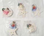 Great Lot of 5 harder-to-find ornaments -- each features a wood angel with satin/lace dress, attached to cardboard star or half-moon-- all have cords for hanging