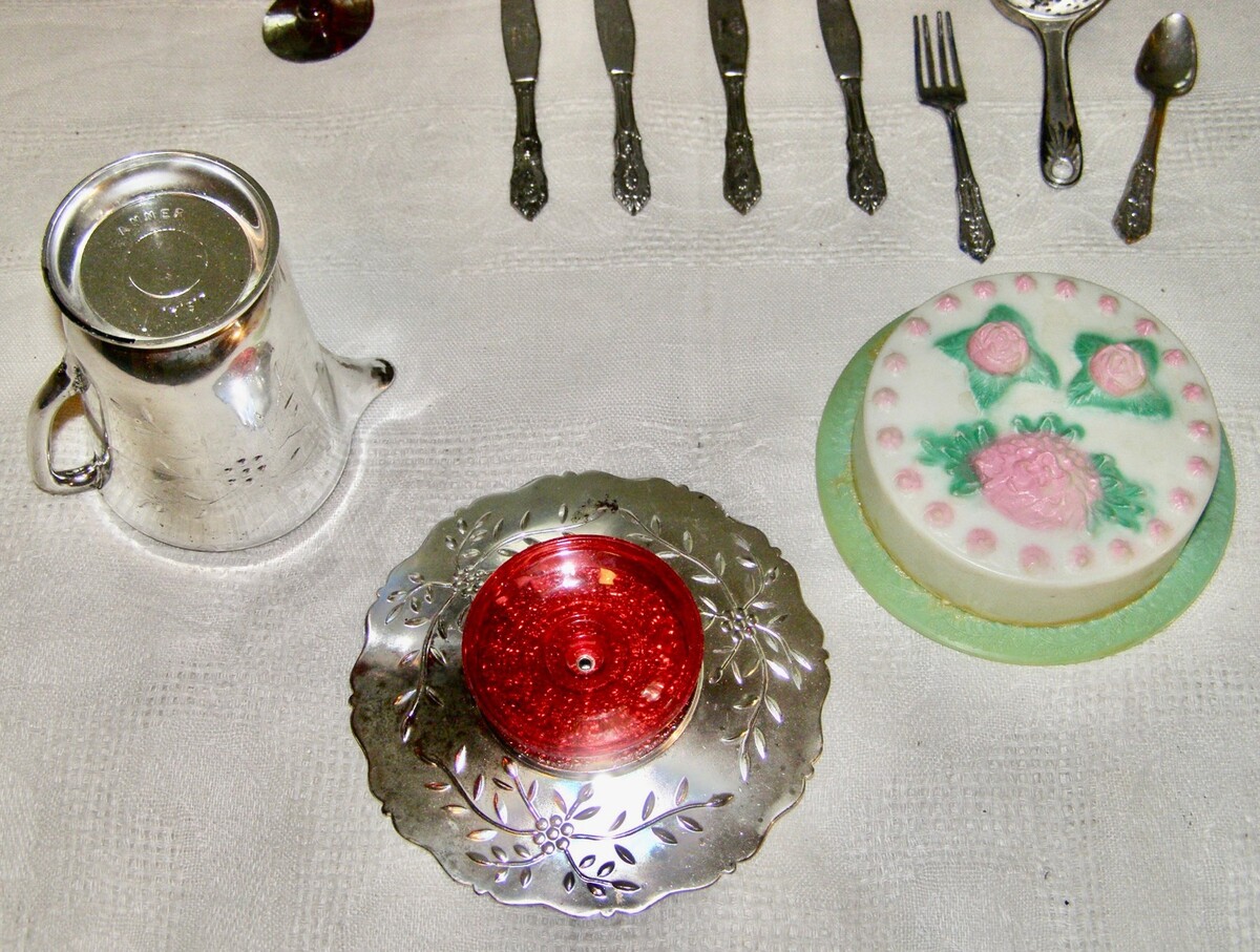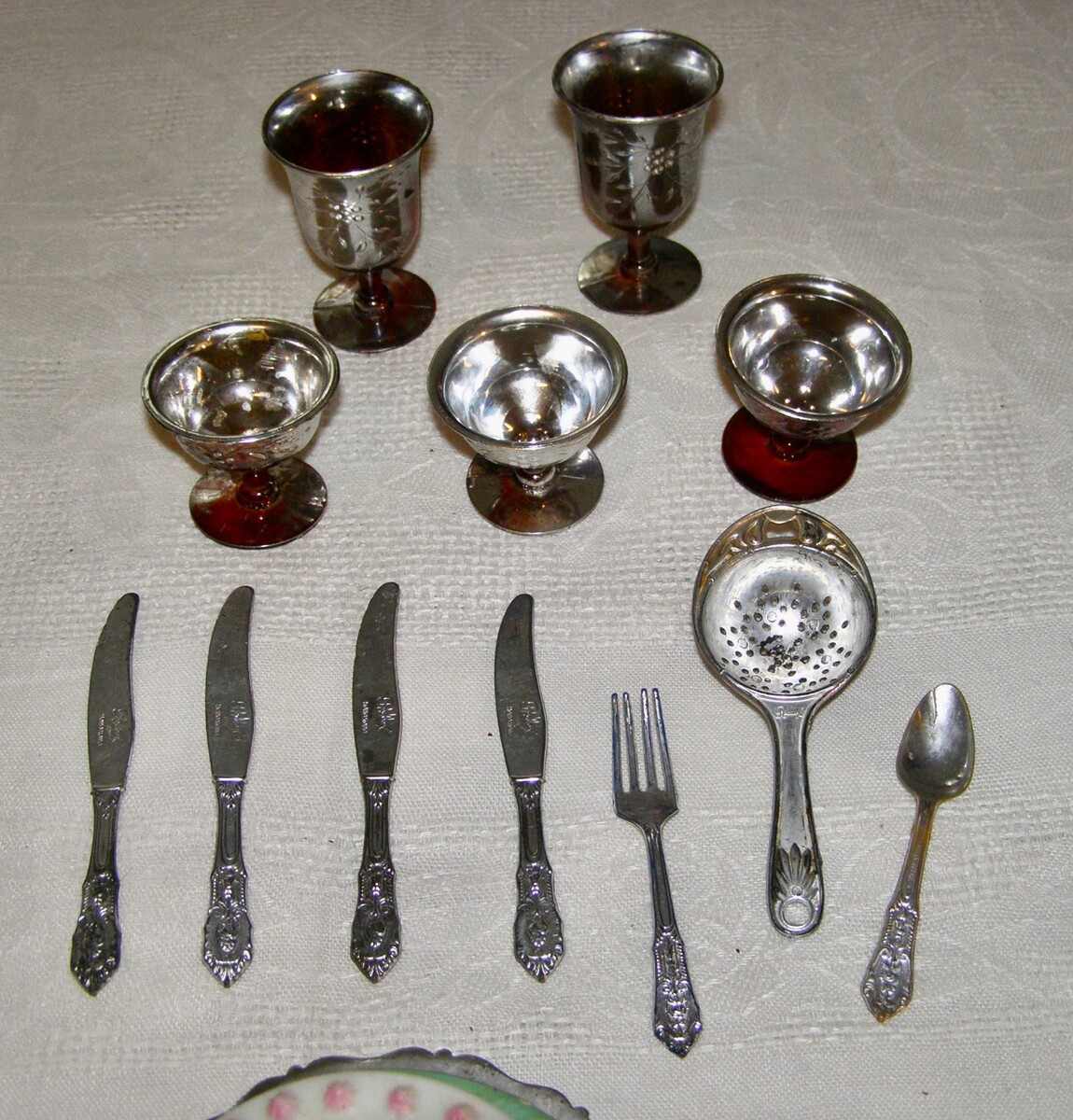 CAKE STAND,GOBLETS,STEMMED DESERT CUPS,CREAMER,SILVERWARE,STRAIN |