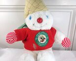 Made in Korea. Vintage snowman plush with red knit sweater. Sweater has a hole and the patch has missing stitches and the holly is not attached. Stuffed animal needs tlc as shown. See pics.