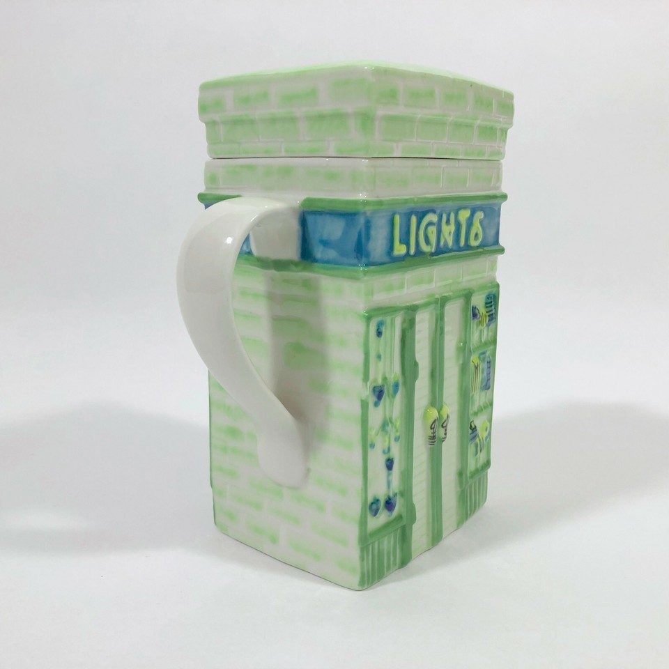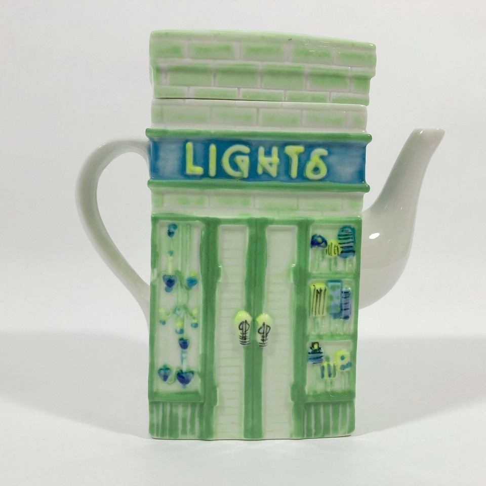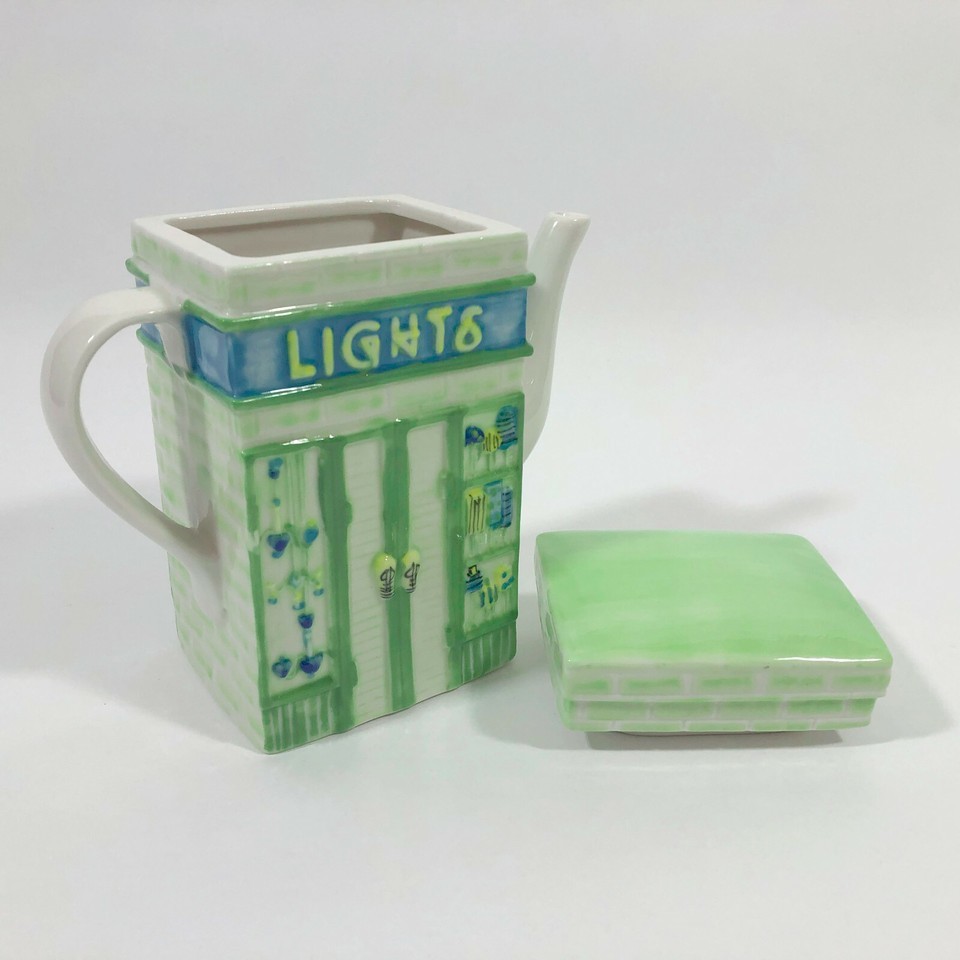 EUC, Excellent Used Condition. This vintage whimsical teapot by MSRF is part of a series showing a store on each side like you would find on any main street. This teapot has a candle shop on one side and a lights store on the other. The scenes are hand painted and the teapot has a glaze finish.