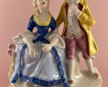 Vintage man and woman figurine. This item is marked with a crown over Made in Japan. The figurine is 6 inches tall, 5 inches in length, and 3 inches across. The woman is seated and dressed in a white, blue, and yellow gown. She has a pink bow in her hair. The man is standing and dressed in a yellow and red coat, white vest and shirt, and pink knickers. Each figurine has on gold shoes. The base has a red, green, and yellow design on the front and a plain design on the back. There is a small whole in the bottom of the woman?s skirt and there are several flea bites in the finish.