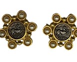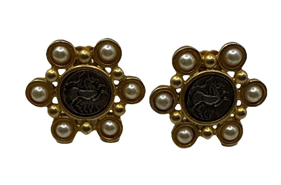 - Vintage Maeve Carr Earrings Gold Tone Zodiac Horse Silver Coin New York Clip On