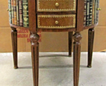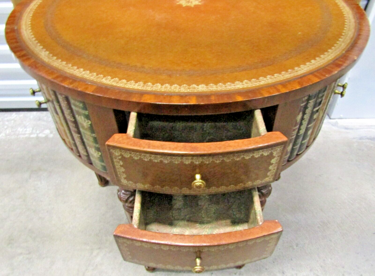 This is a beautiful round table by Maitland-Smith. It has a leather top and tooled leather faux (trompe l'oeil ) book designs on the periphery. There are 3 sets of double doors that open to storage, and 3 sets of 2 drawers. The 6 mahogany legs are carved. The table is about 30" in diameter and 28.5" high. The previous owner had drilled a hole in the center top for a lamp cord. You can easily repair this or leave it for your own lamp. Fort Lauderdale waterfront estate purchase.