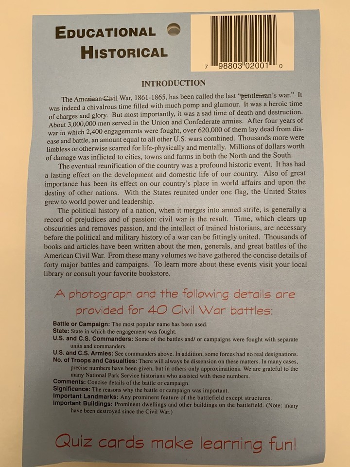 - Vintage Major Battles and Campaigns of the Civil War 40 history quiz cards new