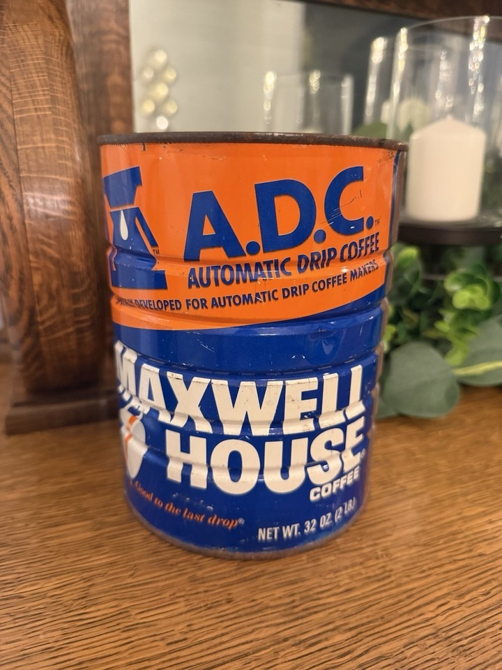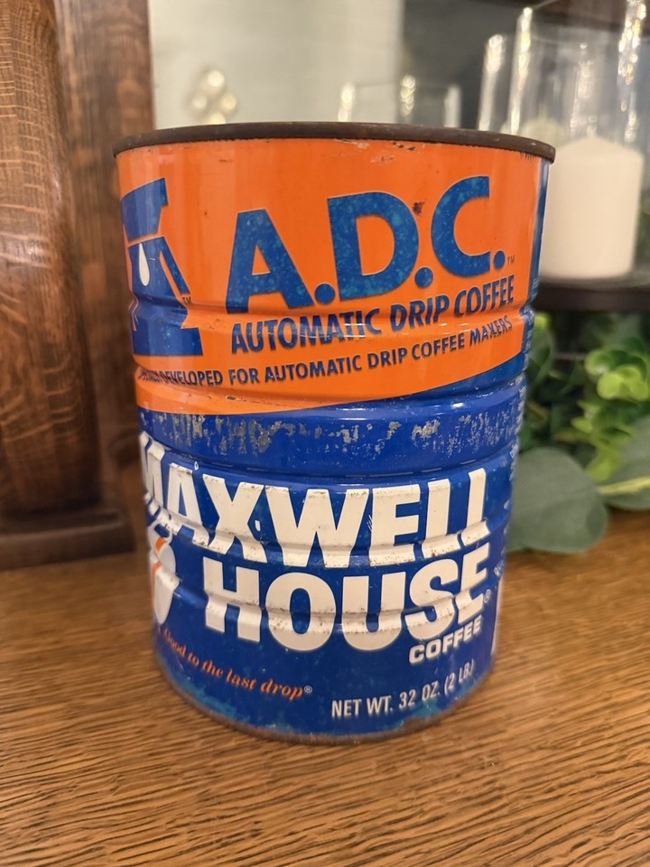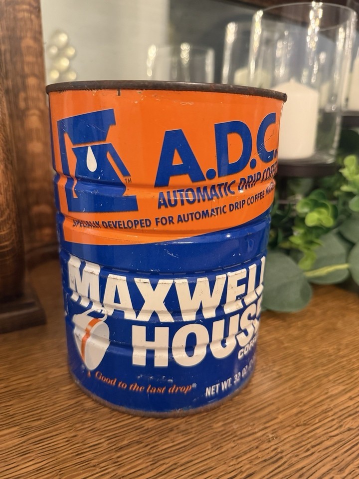 Step back into the golden age of American coffee culture with this striking vintage Maxwell House A.D.C. (Automatic Drip Coffee) one-pound tin. Dressed in bold orange and deep blue, this advertising can proudly carries the slogan ?Good to the last drop!??a reminder of mornings when coffee percolated and drip machines were the latest innovation.