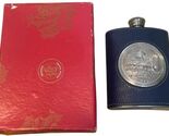 Unused souvenir hip flask from Singapore. Features Merlion and Changi Tower design with blue leather wrap. Made by Dragon Pewter. Includes original box. Measures 5" x 4". Over 20 years old.