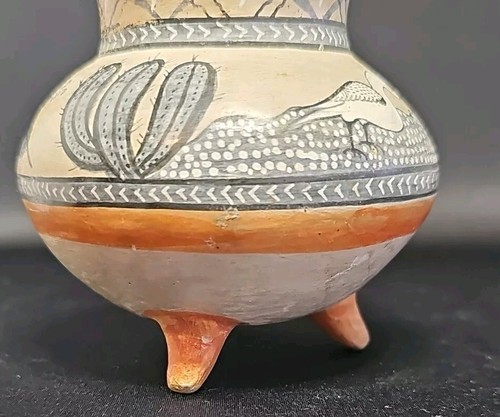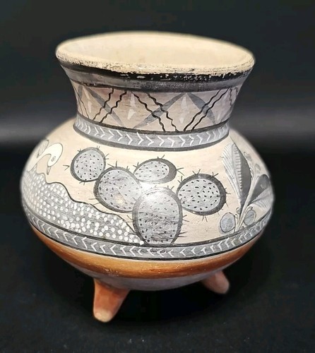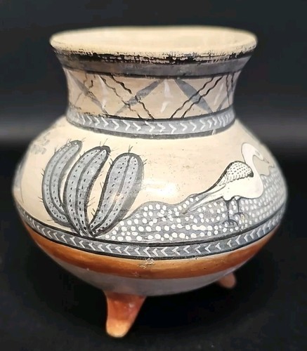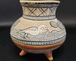 Vintage Mexican Pottery Vase 3 footed WHITE CRANE Bird Botanical MEXICO Signed