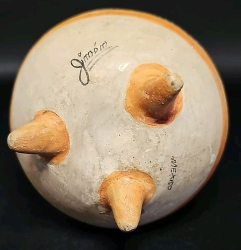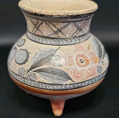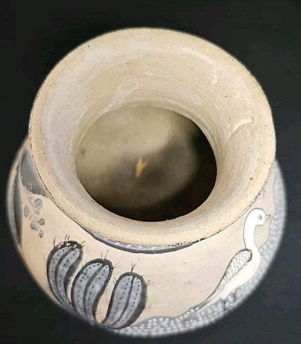 - Vintage Mexican Pottery Vase 3 footed WHITE CRANE Bird Botanical MEXICO Signed