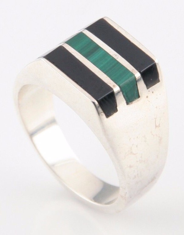 - Vintage Mexikanisches Sterlingsilber Ring Mit Malachit & Onyx (Eu 11) Taxco