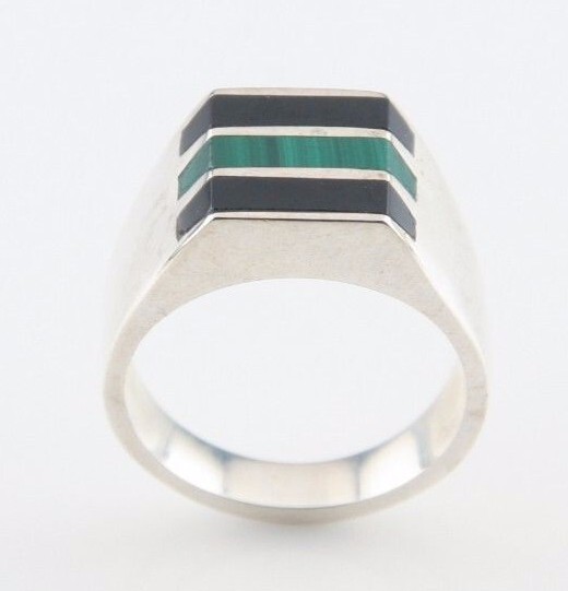 Dieser Ring besteht aus einem einzelnen Stück grünem Malachit und zwei Onyx -Teilen, die in einen schonen silbernen Ring eingefügt werden