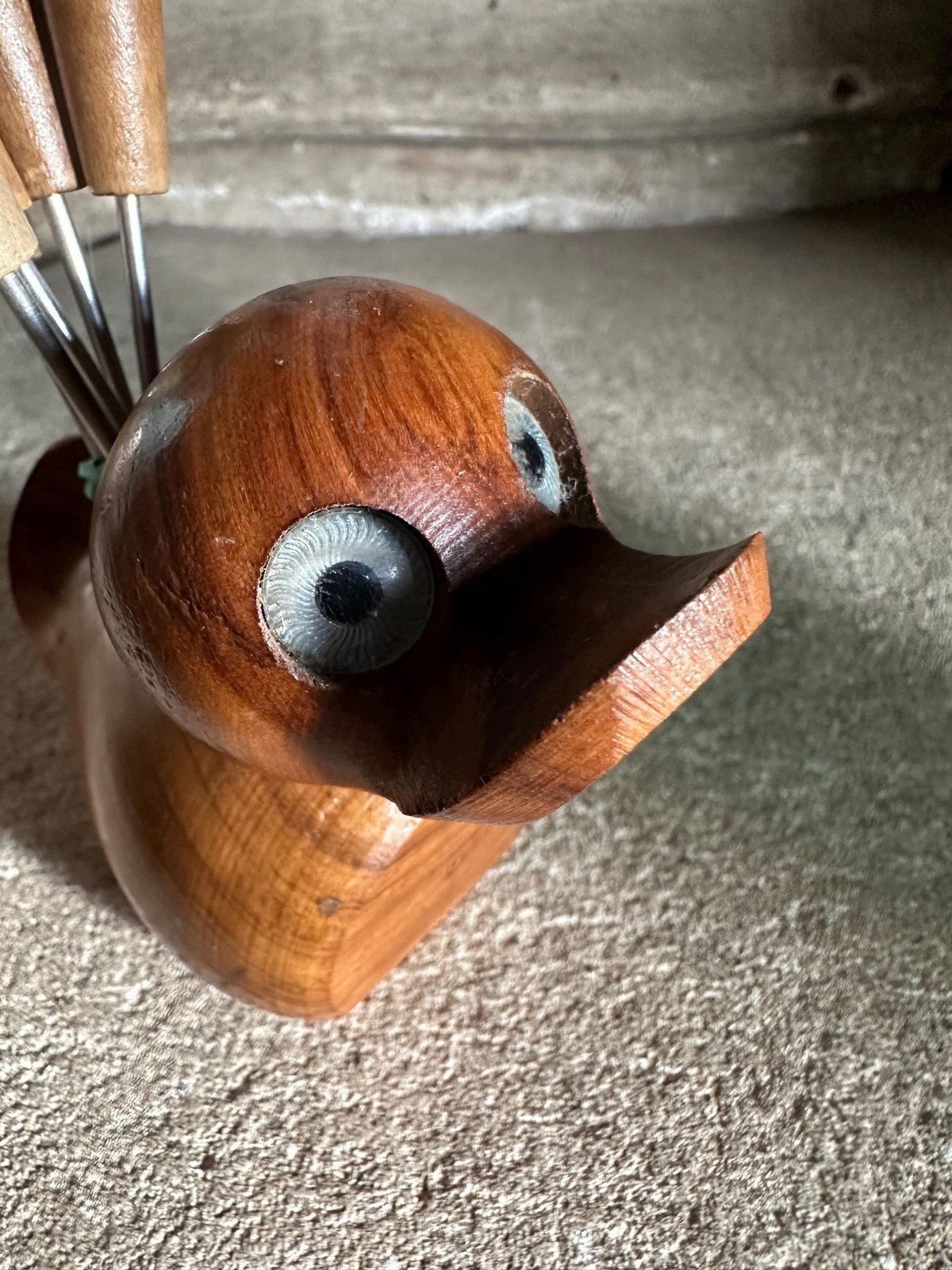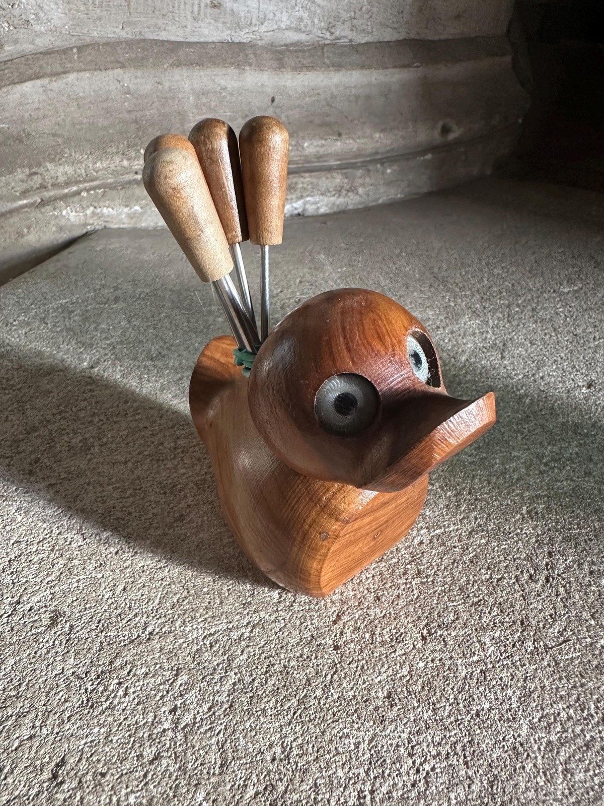 - Vintage Mid Century French Retro Rustic Wooden Bird (Duck?) Coctail Pick Holder