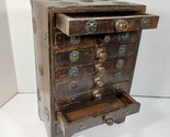 - Vintage Miniature Chest of Drawers Wood Cabinet Metal Accents Jewelry 14” Tall