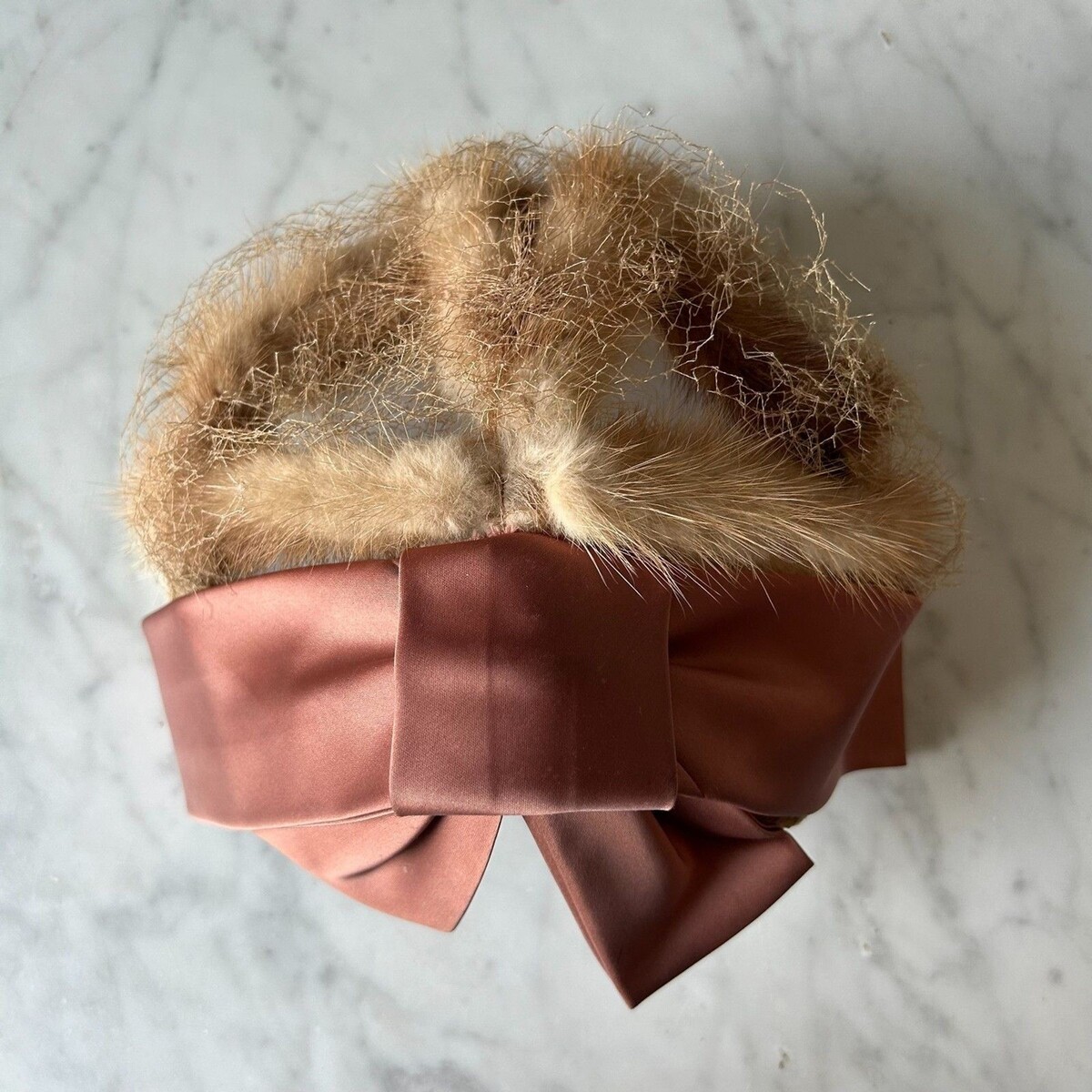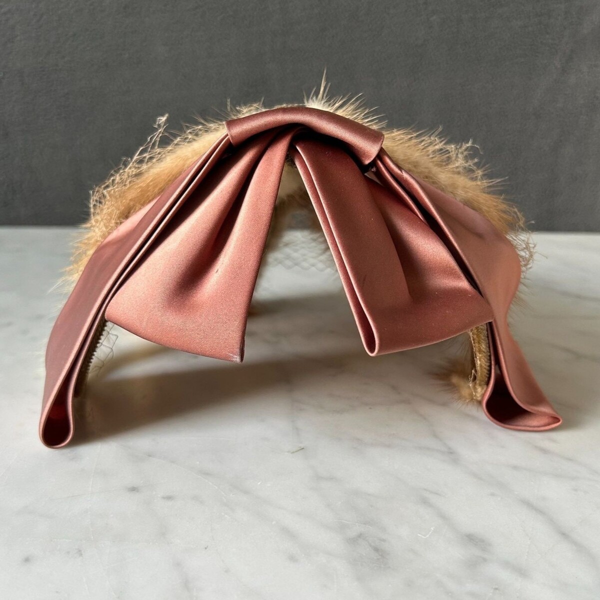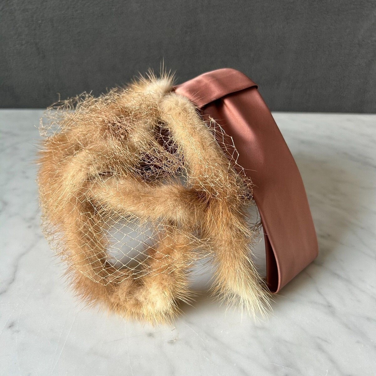 - Vintage Mink Fur Champagne Satin Ribbon Bow Fascinator Women's Hat Veil Netting