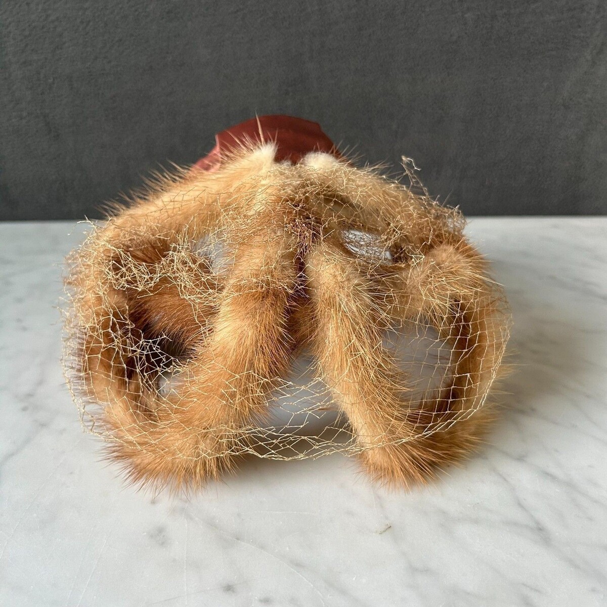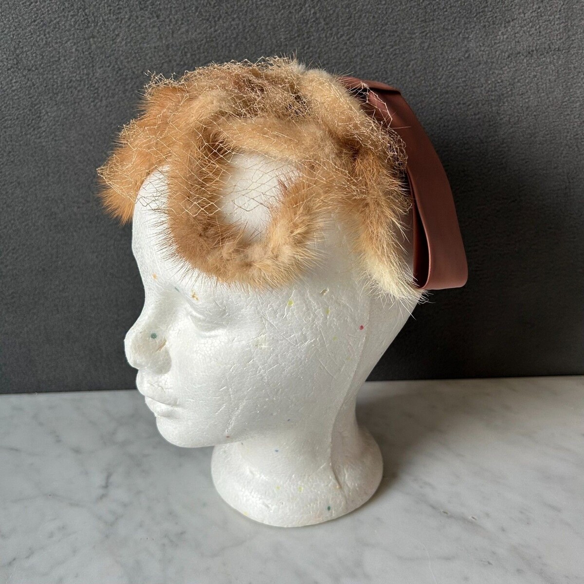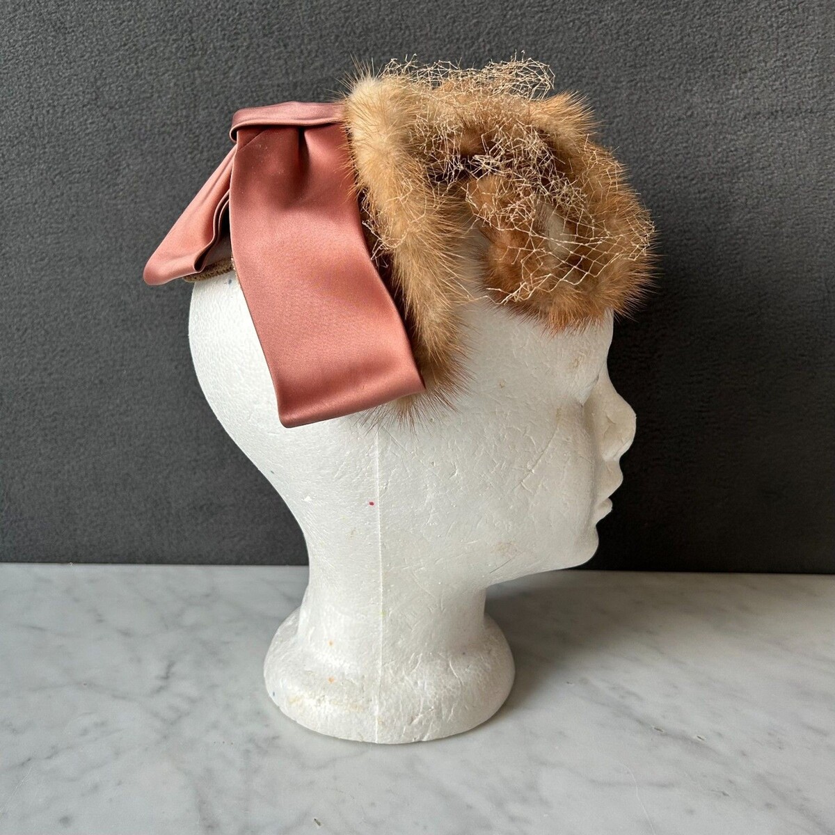 - Vintage Mink Fur Champagne Satin Ribbon Bow Fascinator Women's Hat Veil Netting