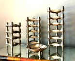 The Vintage Modular Candle Holders by Ceasar Stoffi and Fritz Nagel are small, abstract-shaped candlesticks made of metal in a chrome finish. Suitable for both mini candles and taper/dinner candles, these vintage/retro styled candle holders are decorative and perfect for a variety of uses. With a spaceage, danish, mcm, and midcentury theme, these German-made candle holders add a touch of unique and stylish elegance to any home decor setting.