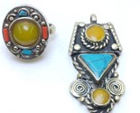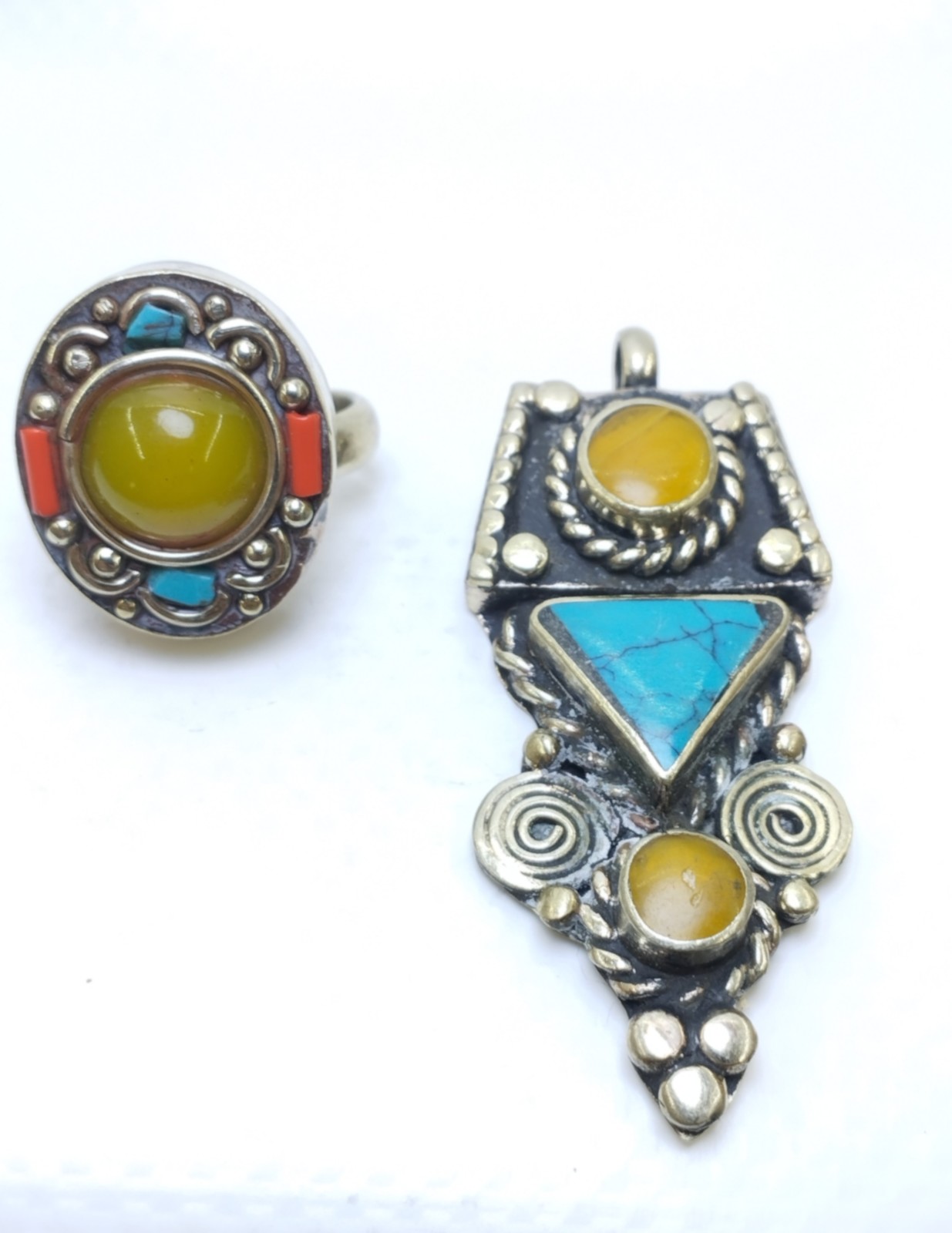 Both pieces are crafted from silver-plated copper and adorned with turquoise and amber-like stones.