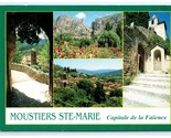 This original vintage postcard features four vibrant lithograph images showcasing the picturesque village of Moustiers-Sainte-Marie in the Alpes de Haute-Provence, France. Known as the "Capitale de la Faïence," this charming destination is famed for its beautiful faience pottery and stunning natural surroundings, including the nearby Gorges du Verdon. The postcard captures scenic views of rustic stone architecture, lush greenery, vibrant flowers, and the dramatic limestone cliffs that frame this historic village.