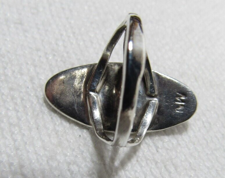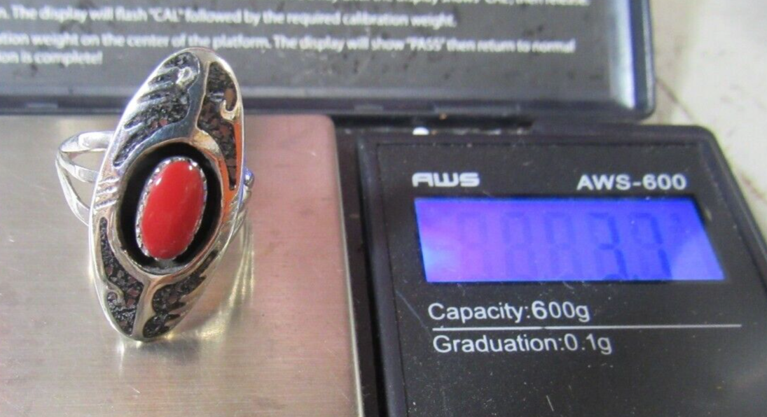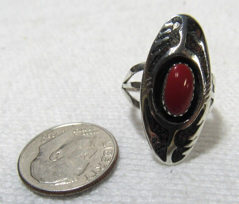 From Wewoka St Pawn of Oklahoma we have a Beautiful vintage Native American Sterling Silver Coral Ring by Myra Nastacio from the Zuni tribe. This is a vintage ring with a Oval Red Coral in Shadow Box style with Coral Inlay around the top. It is in a Size 6 and is 1" tall 1/2" wide with a 1.5 mm band. It is marked Sterling, tested and is Sterling Silver and weighs 3.7 grams, it is also marked MN for Myra Nastacio Zuni. It does have wear and light scratches but is a beautiful Native American Ring. See photos for more details.