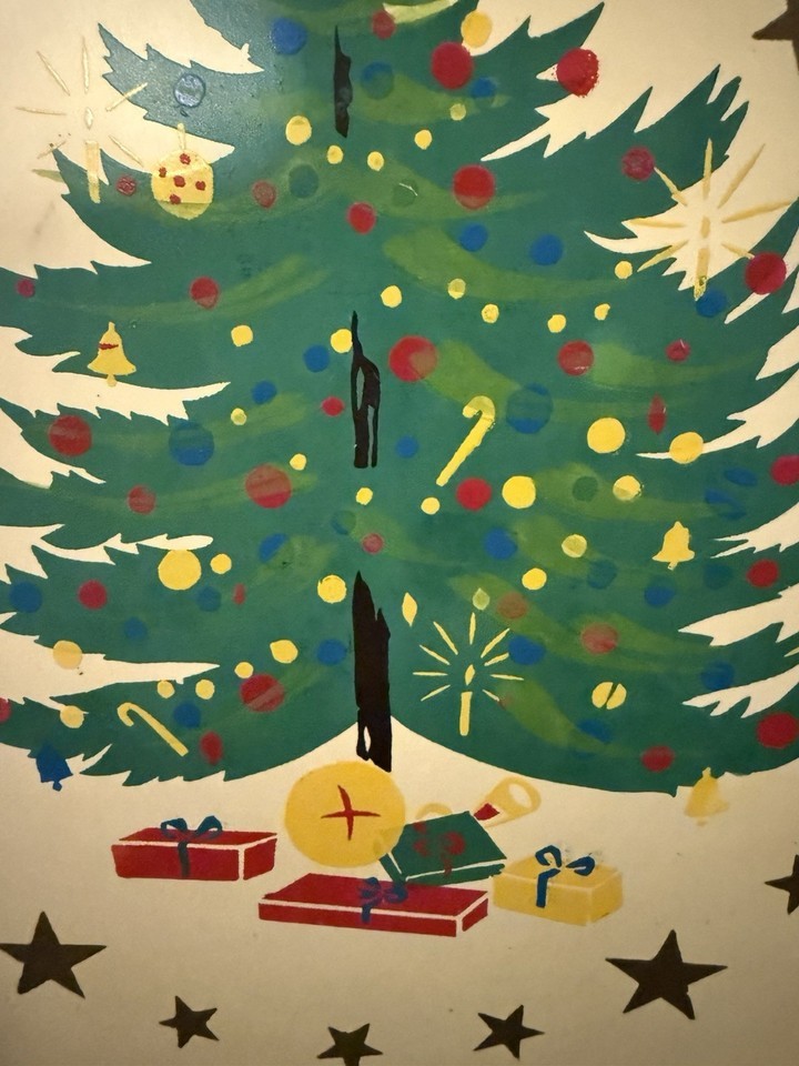 ? Classic mid-century holiday design with a Christmas tree, gifts, and golden stars